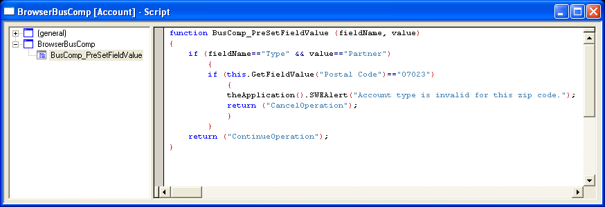 Figure 41 includes an example of how you can use a browser script to validate the field in a form that Siebel CRM displays in the Siebel client. This example uses browser script on the BusComp_PreSetFieldValue event handler in the Account business component.