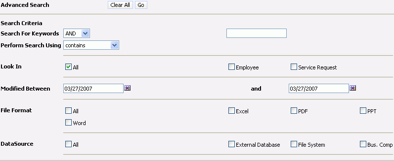 Siebel Developer's Reference > Siebel Templates for Employee Applications > Search Templates > Advanced Search TemplateThe Advanced Search template uses the AppletSearchAdvanced web template. It defines a specialized applet that displays advanced search. This template uses the following structure: Figure 42 includes the Advanced Search applet. Table 68 lists the items that Siebel CRM can map for this template. For more information, see About Mapping IDs to Placeholders. |