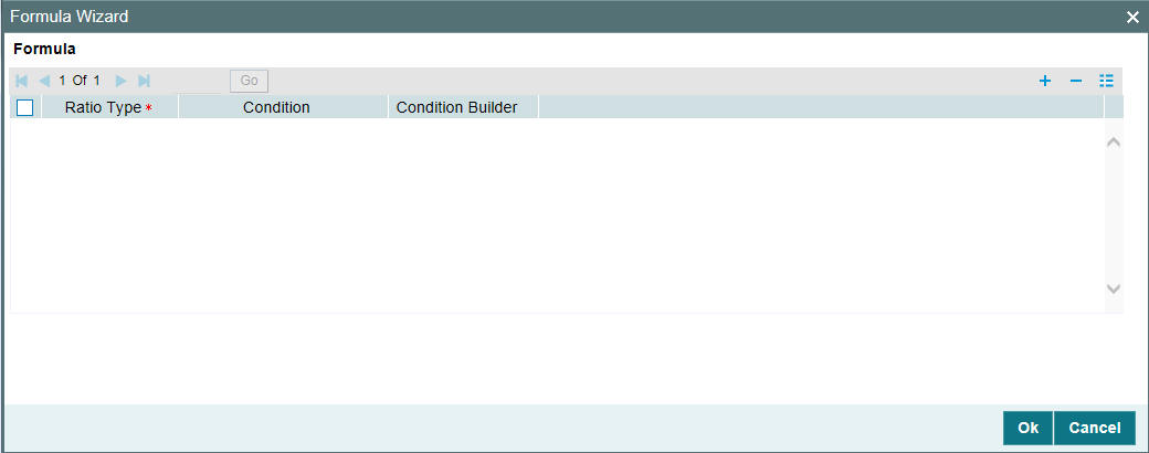 You can specify the formula to calculate the credit ratio by clicking the ‘Formula’ button corresponding to a ratio ID. The ‘Formula’ screen is displayed where you can specify the condition for calculating the credit ratio associated with a ratio ID.