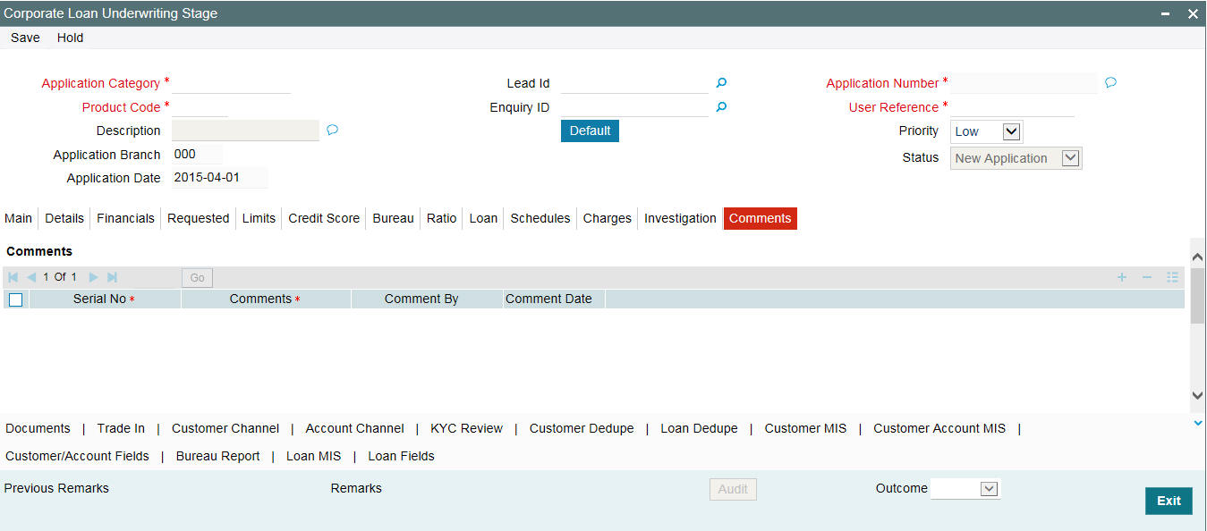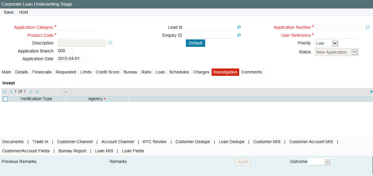 The credit agencies and the bureaus maintained for the Application Category are displayed in this screen: You can capture the remarks and recommendations from these agencies in this tab. You can also view the credit report obtained from the agencies and bureaus.