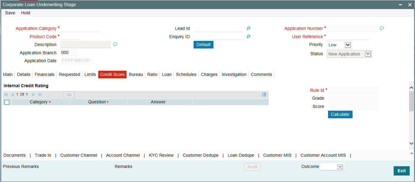 Click ‘Calculate’ button to calculate the credit score and the grade, based on the formula maintained for calculating the credit score. The ‘Grade’ and the ‘Score’ are displayed based on this calculation.