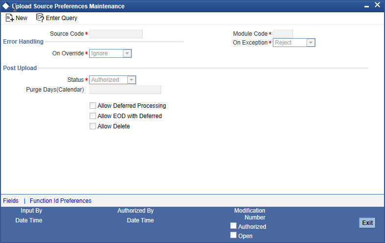 You can set preferences for upload of data from an external source in the ‘Upload Source Preferences Maintenance’ screen. You can invoke the ‘Upload Source Preferences Maintenance’ screen by typing ‘CODUPLDM’ in the field at the top right corner of the Application tool bar and clicking the adjoining arrow button.