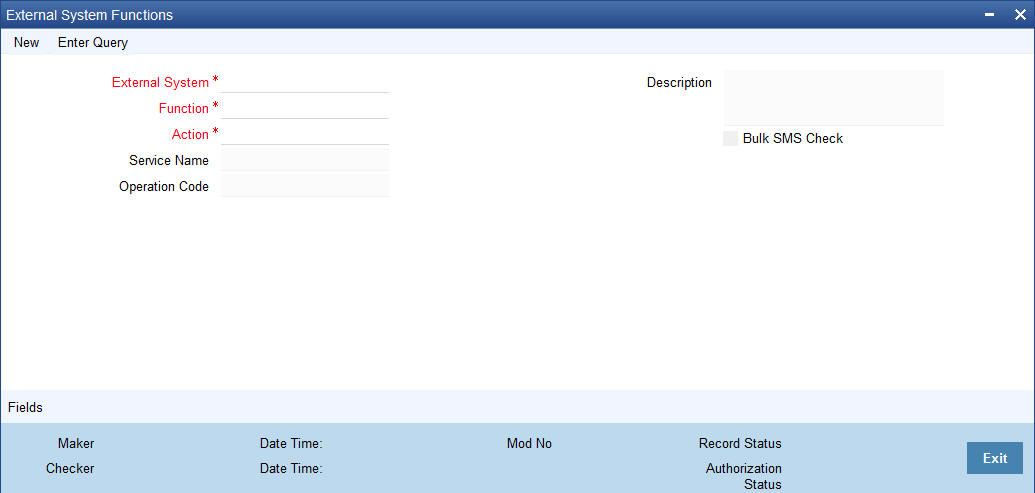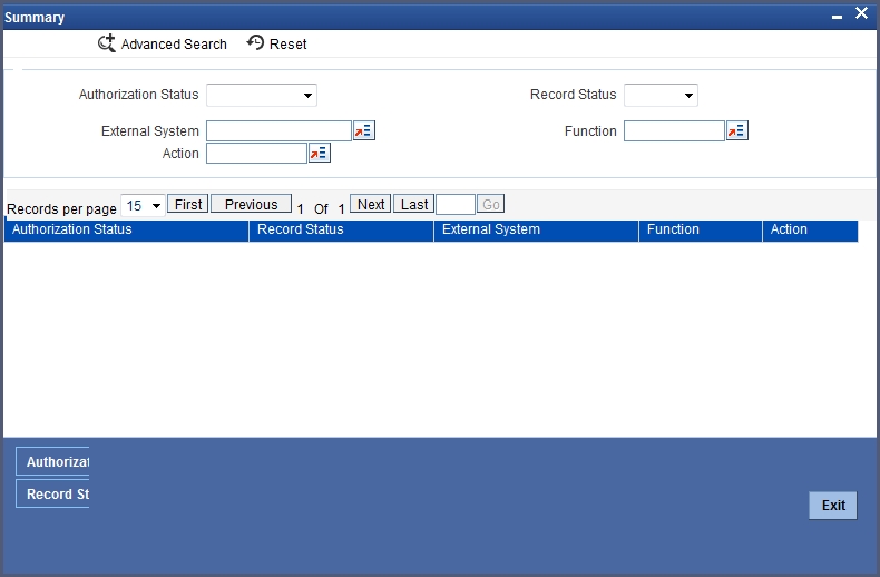This summary screen can be used to search for external system functions which match any of the following criteria: