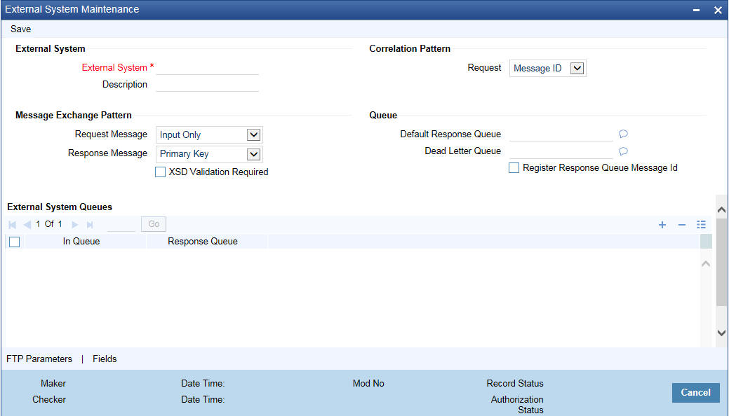 For example, if we have a record that is created by a specific external system say 'CRM', and the requirement is that, for records created by this specific external system, only a set of fields are modifiable then, we should specify Origin System as CRM and FLEXCUBE as the External System. This Origin System field is used to identify such requirements wherein the amendable fields can be different if the Origination and Modification of the record are of different external sources.