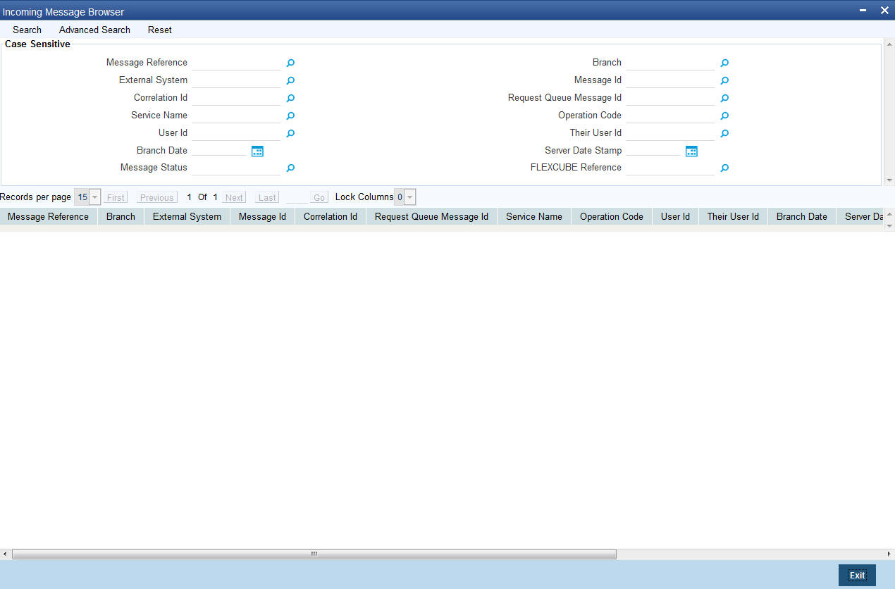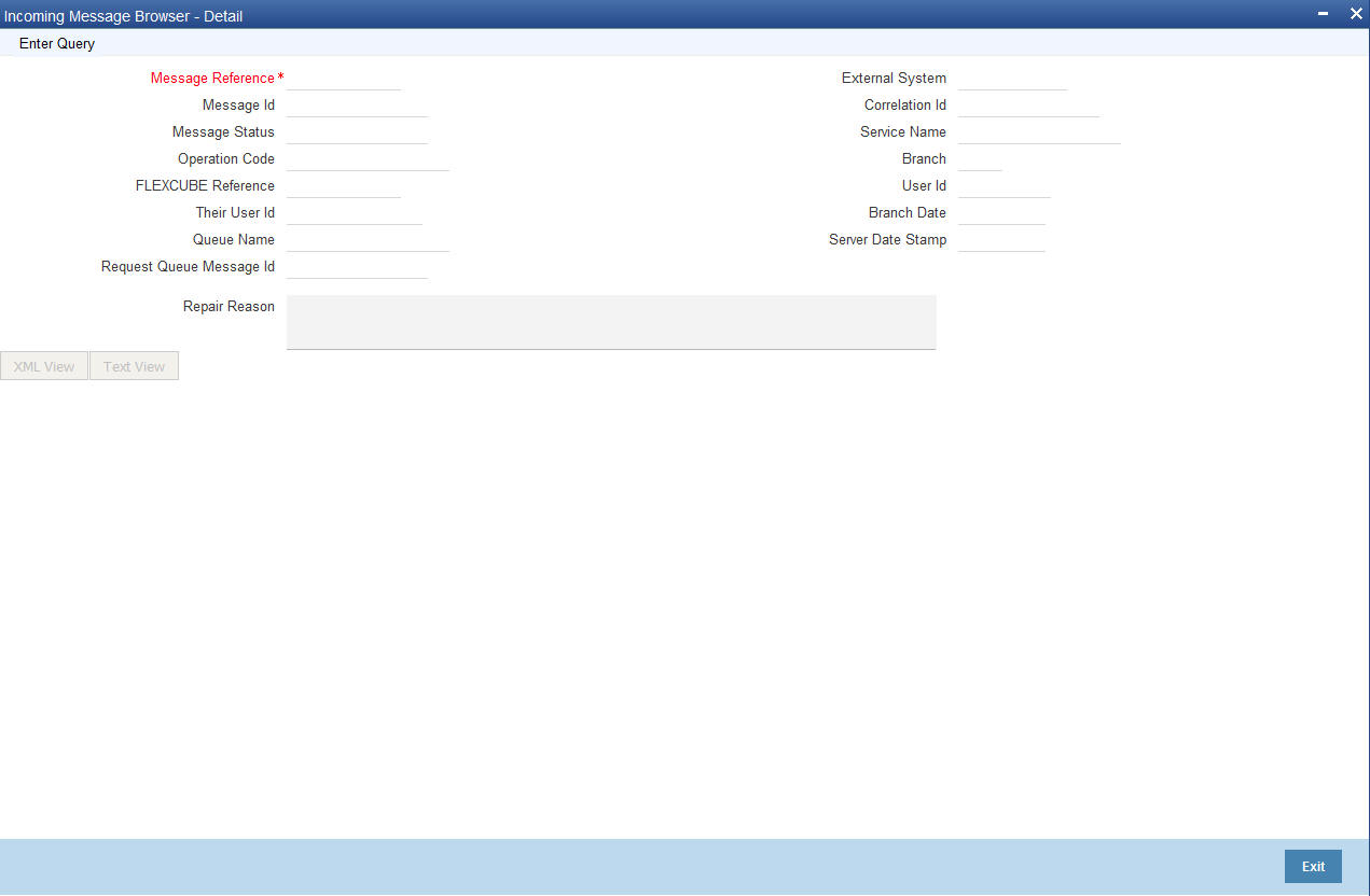 In the ‘Incoming Message Browser’ screen you can view the details of the messages received from the external systems. You can also view the messages in the XML format or the Text format.