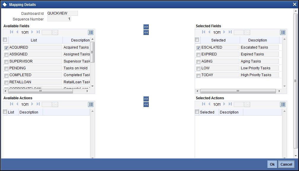 In this screen, you can select the required fields and actions for the dashboard from the Available Fields and Available Actions. Available fields displays all the queues maintained from SMDQUEMT screen, if the option selected is Count in queue type. Available action displays all the actions listed in the header of the task bar. On clicking the right-arrow button, system moves the selected fields and actions to the Selected Fields and Selected Actions sections respectively. Similarly, to de-select an action or a field, click the left-arrow button. Available fields displays blank if the queue type is selected queue and if the option is selected as ‘Queue’.The mapping details are not allowed if the queue type is selected as BAM. The system displays an error message as “No field mappings available for selected queue criteria”.