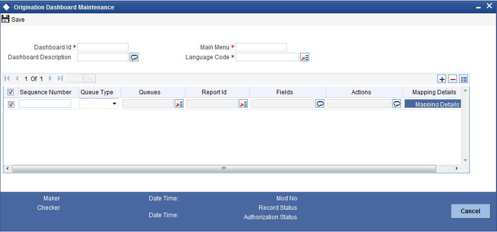You can select the fields and actions by clicking the ‘Mapping Details’ button in the ‘Origination Dashboard Maintenance’ screen. This screen is used to select the action and columns that you want to perform on a particular frame of the dashboard ..
