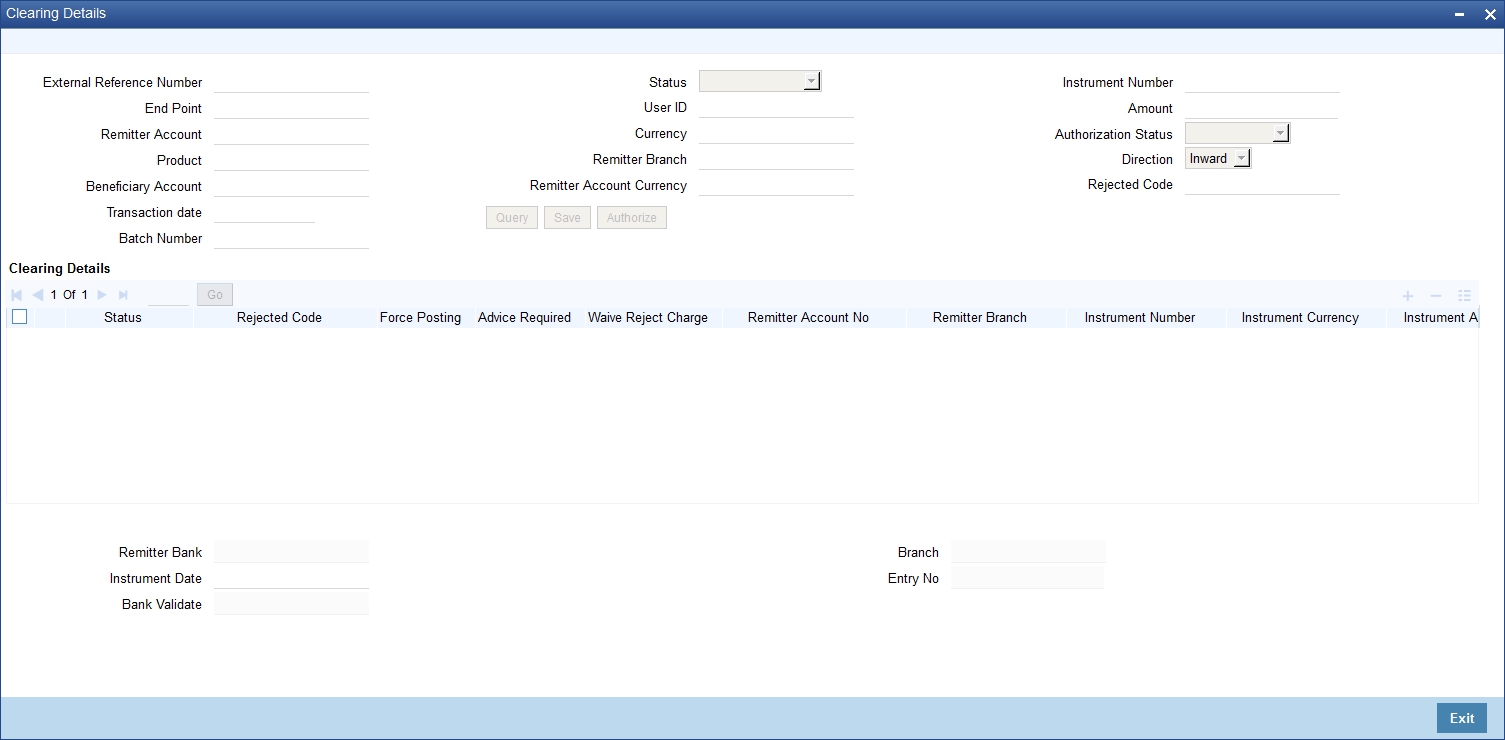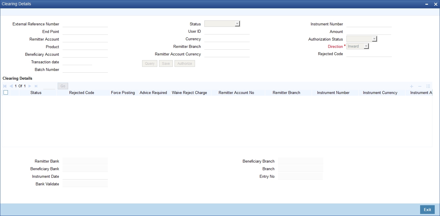 You can view inward clearing transactions in the ‘Inward Clearing Transaction Query’ screen, where you provide the details of the check instruments as well as the clearing details. You can invoke this screen by typing ‘CGDIWQRY’ in the field at the top right corner of the Application tool bar and clicking on the adjoining arrow button.
