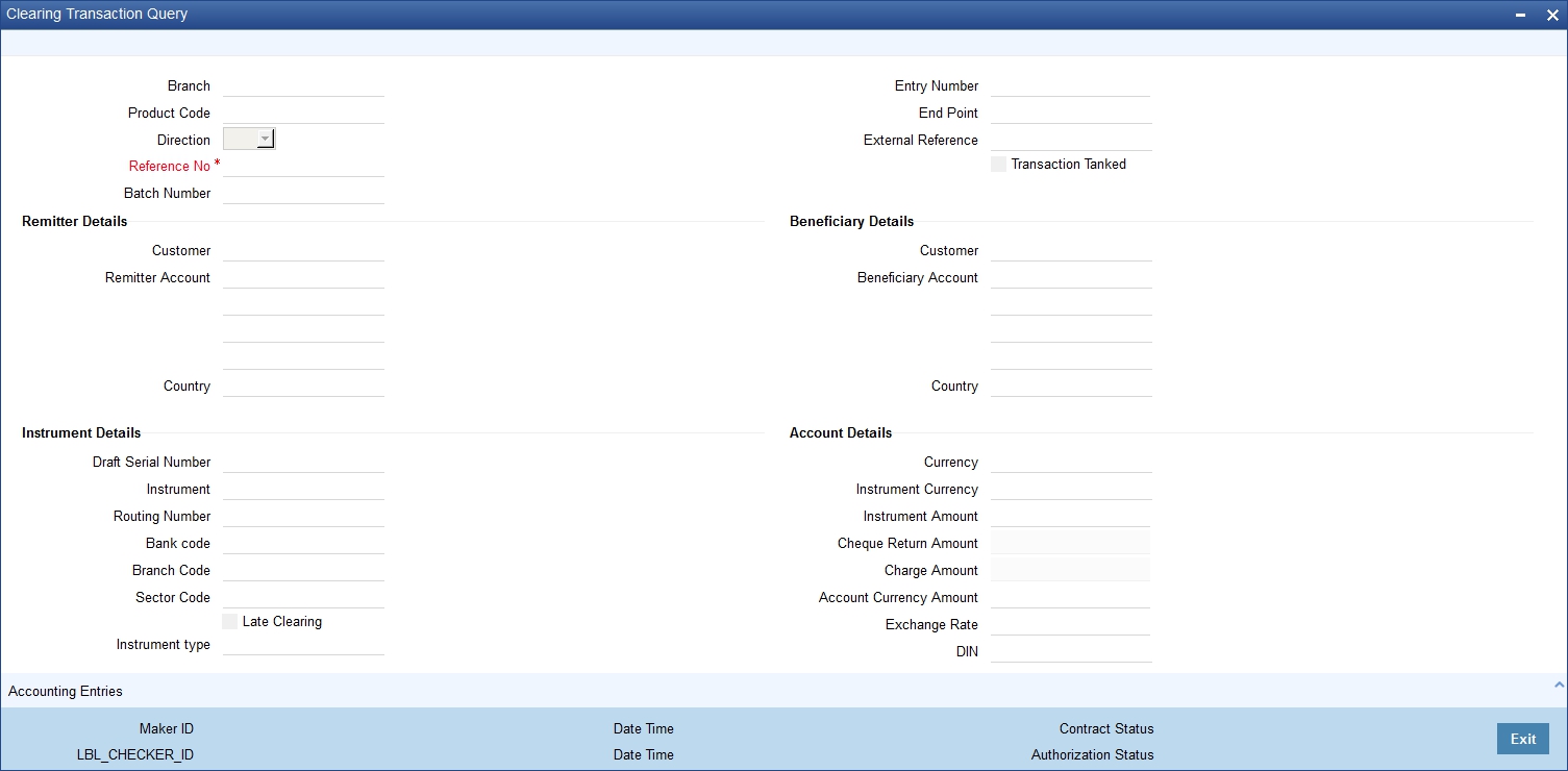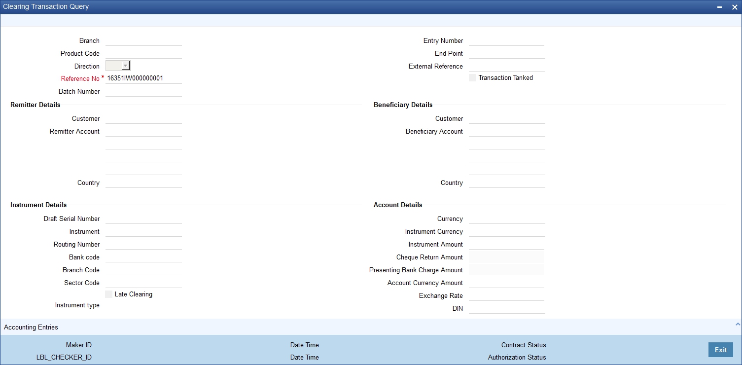 You can view the processed clearing records through the Clearing transaction screen. You can reverse a transaction or input a transaction through this screen. Also, you can query/view the list of transactions with a particular reconciliation status.