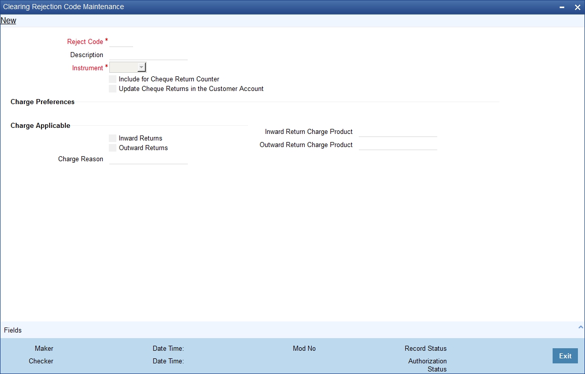 You can levy charges on dishonored cheques based on the reason for rejection. Invoke the ‘Clearing Rejection Reason’ screen from the application browser.