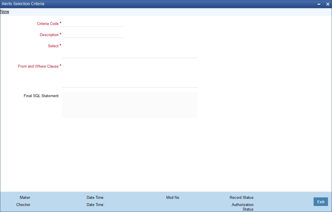 To define the criteria as SQL statement, you need to have sufficient understanding about the data model of Oracle FLEXCUBE and SQL programming language.