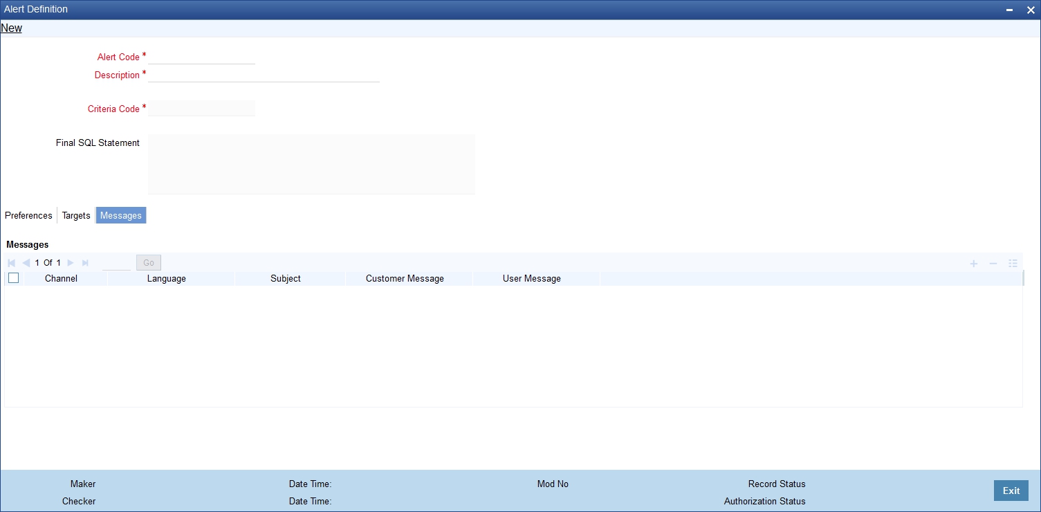 Further, in ‘Alert Definition’ screen under ‘Message’ tab, you need to create an alert message as follows: