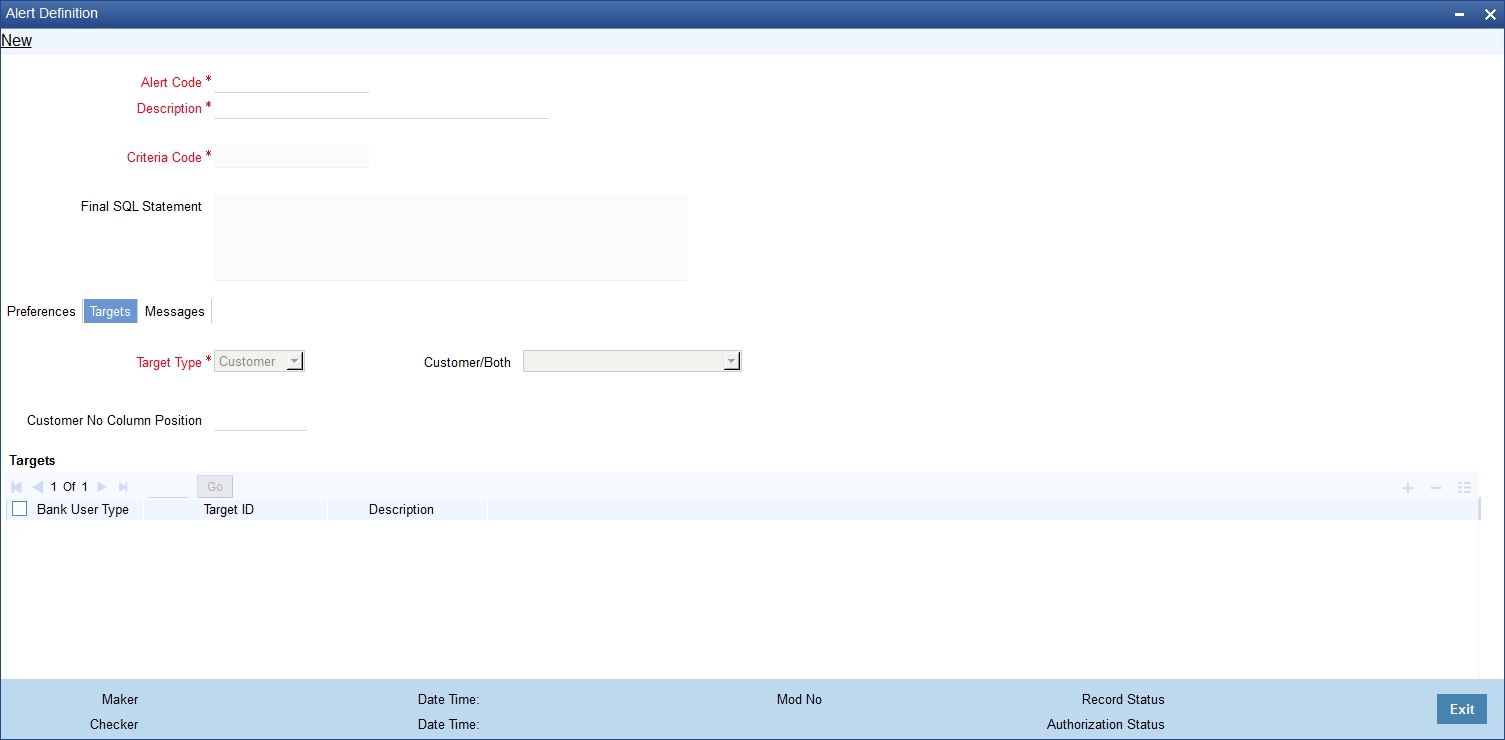 You can capture the details of the customer and bank users for who will receive the alert message. Click ‘Target’ tab.