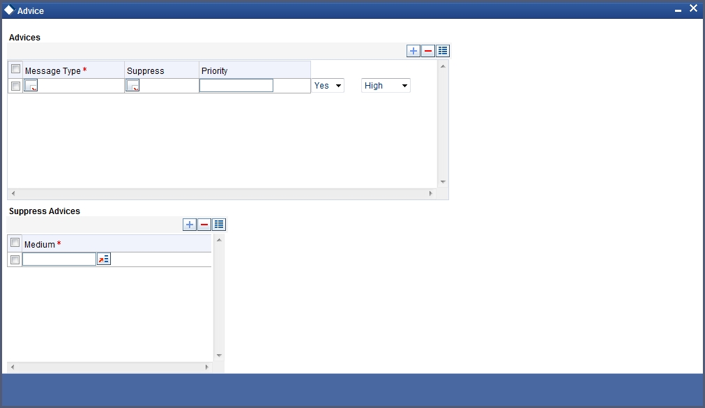 You can view the advices defaulted which also includes the Payment Message in the ‘Advices’ screen. To invoke this screen, click ‘Advices’ button on the ‘Manual Disbursement’ screen. You can also choose to suppress the messages as required .