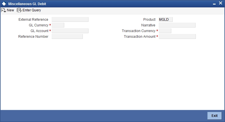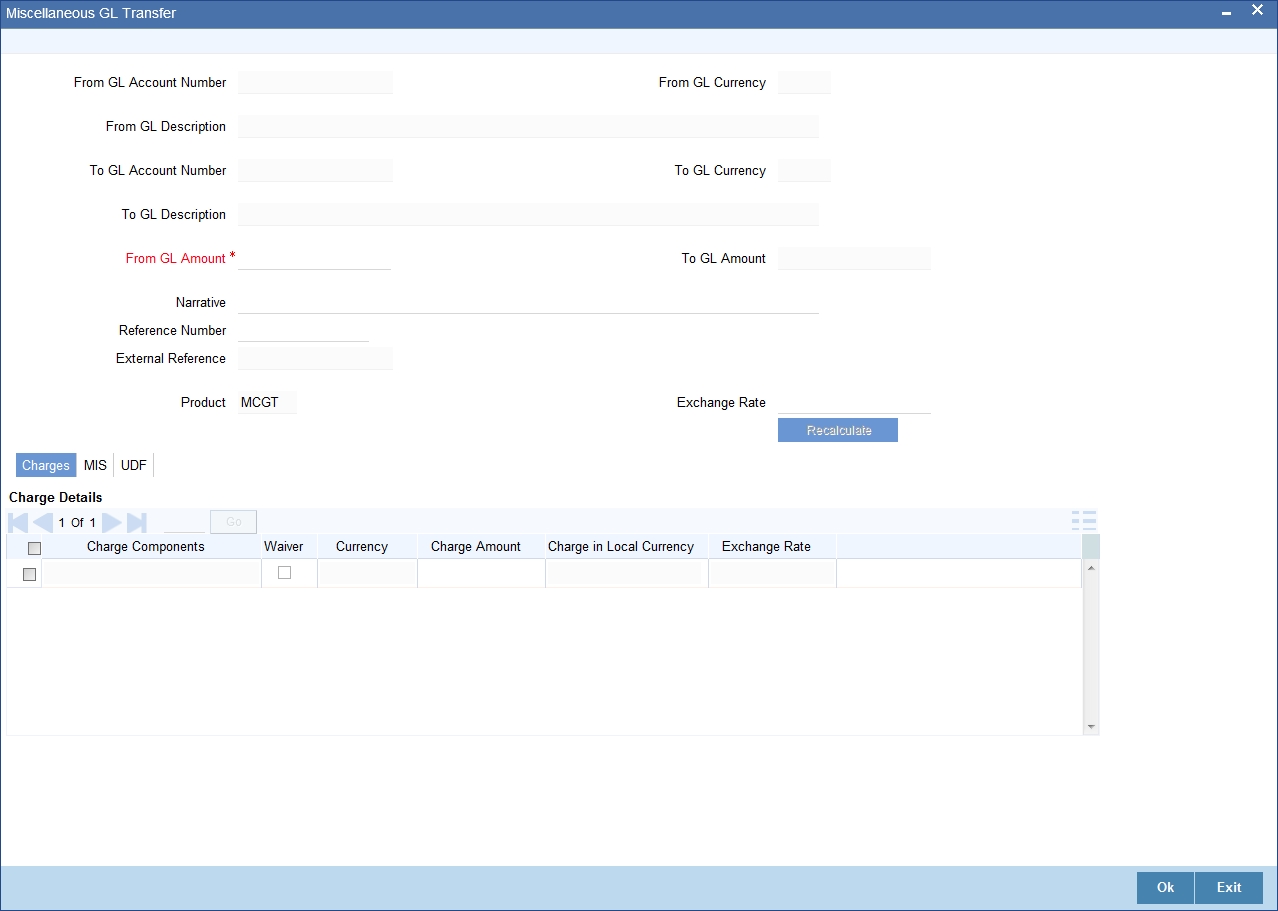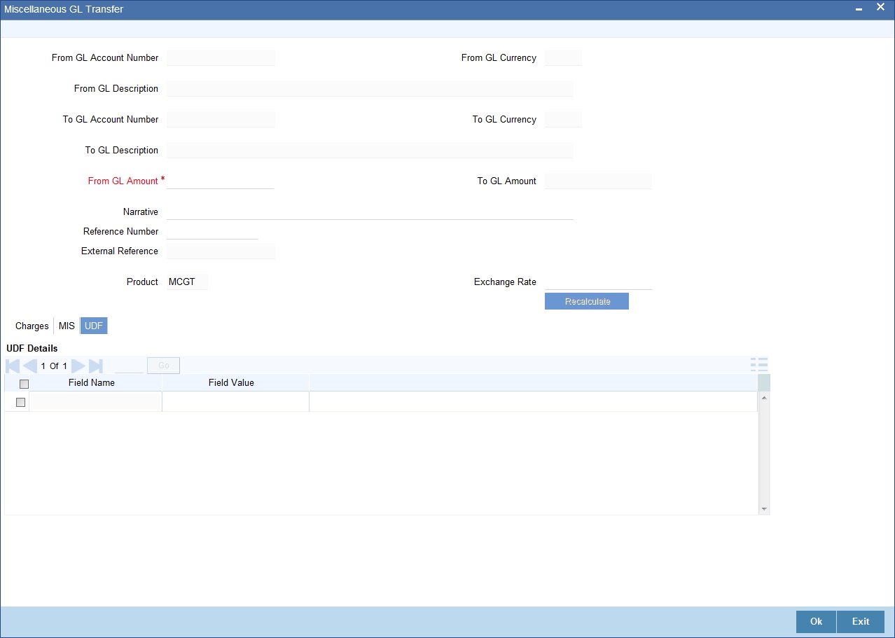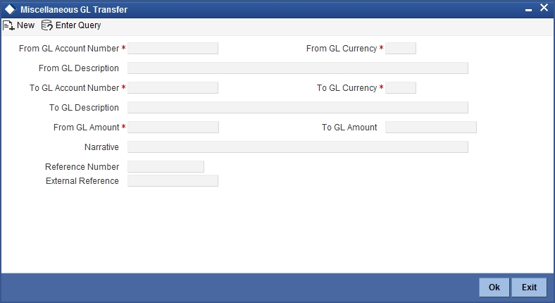 You can transfer funds from one GL account to another using Miscellaneous GL. Use the ‘Miscellaneous GL Transfer’ screen to transfer funds. You can invoke this screen by typing ‘1005’ in the field at the top right corner of the Application tool bar and clicking on the adjoining arrow button.