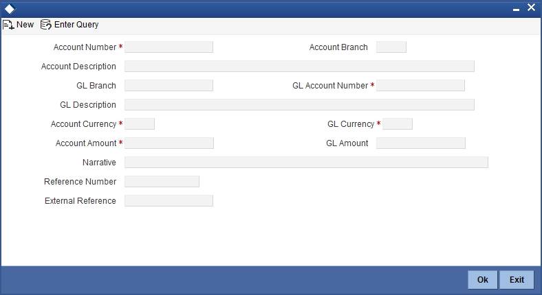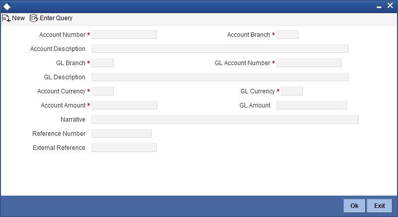 NoteBased on the account number specified, the system will display the Account Branch, Account Description, Account Currency and GL Currency for the corresponding account. The option list displays all valid account numbers applicable. Choose the appropriate one.