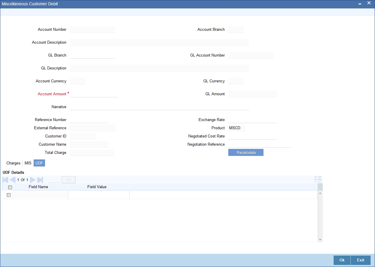 For more information on UDF details screen, refer to the section ‘Specifying the UDF details’ in the chapter ‘Miscellaneous Debits to a Customer’s Account’ in this User Manual.