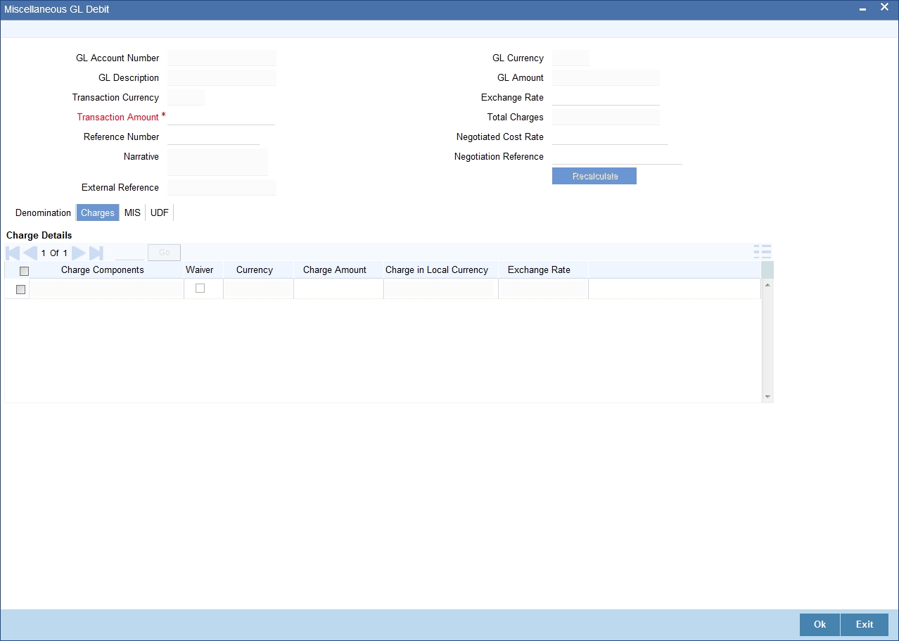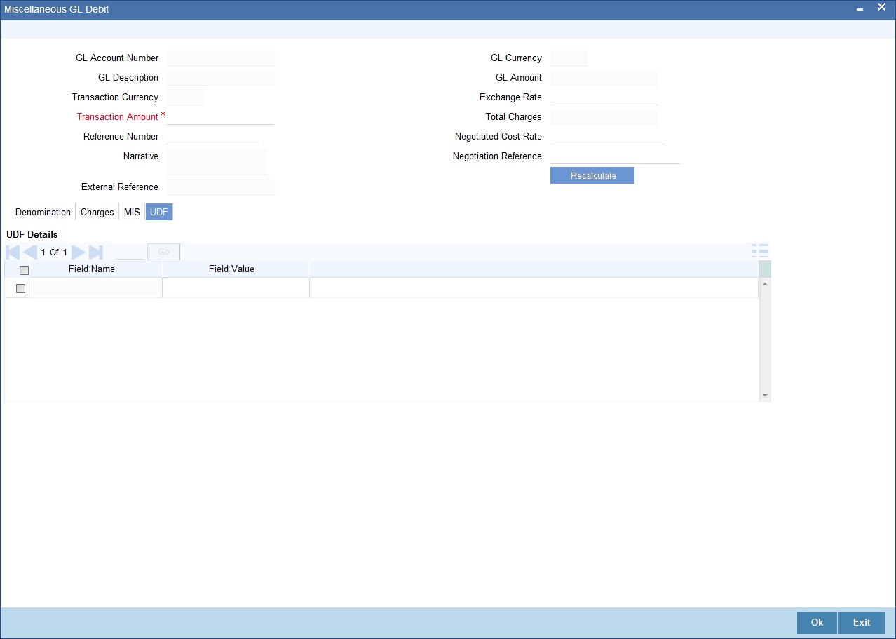 If you modify the transaction amount, then click ‘Recalc’ button to re-compute the amount to be debited from the GL account.