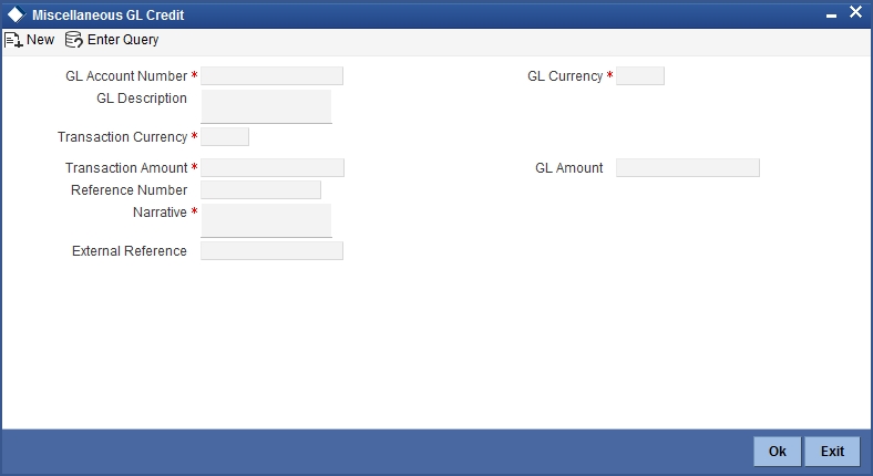 You can perform General Ledger transactions such as miscellaneous debit and credit transactions against a customer's CASA account and a GL account.