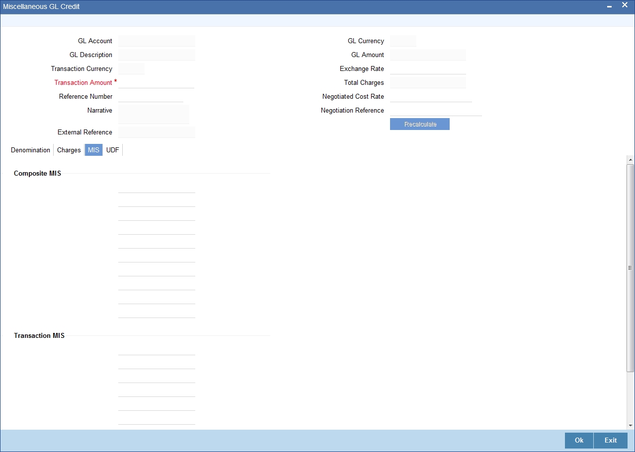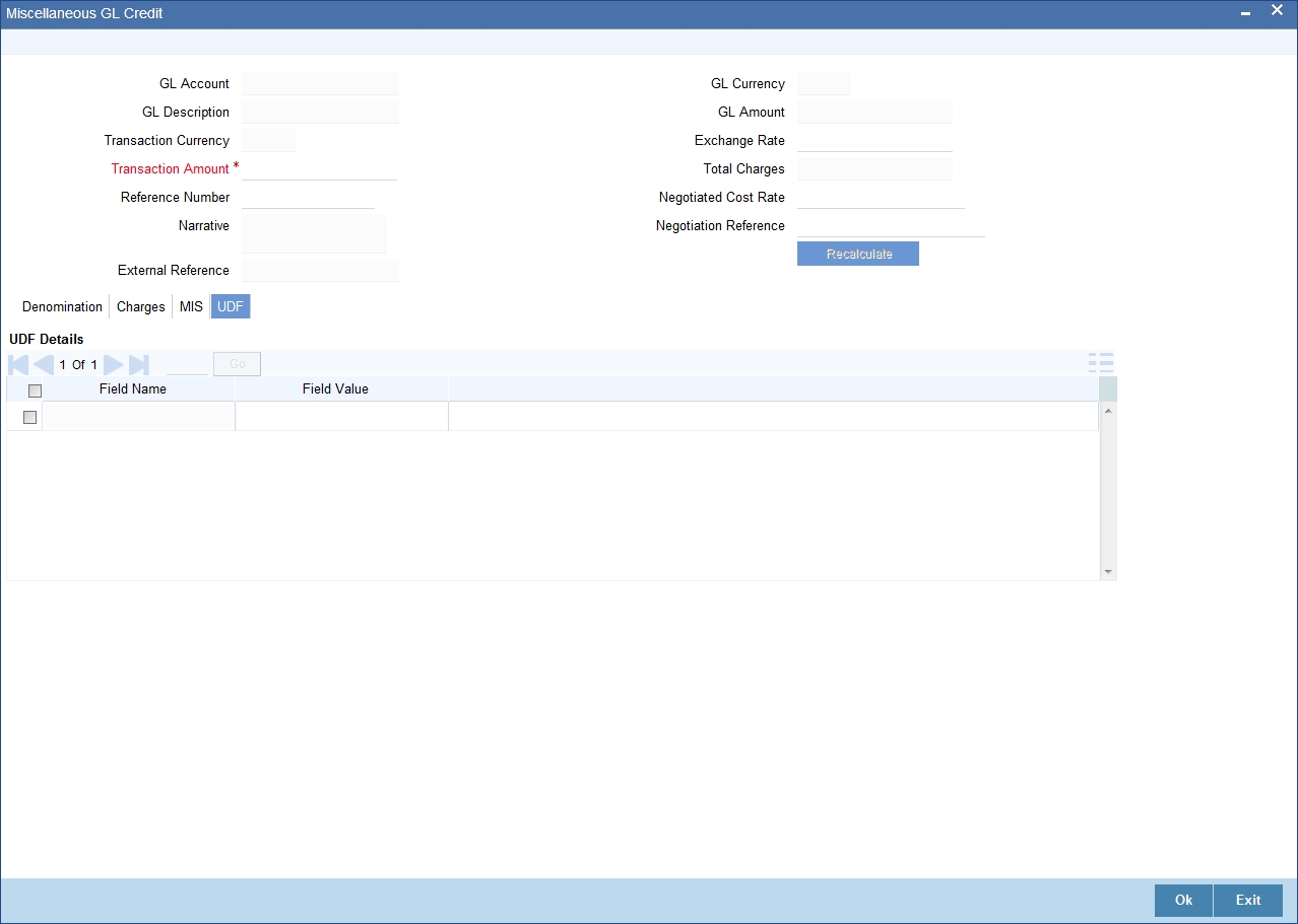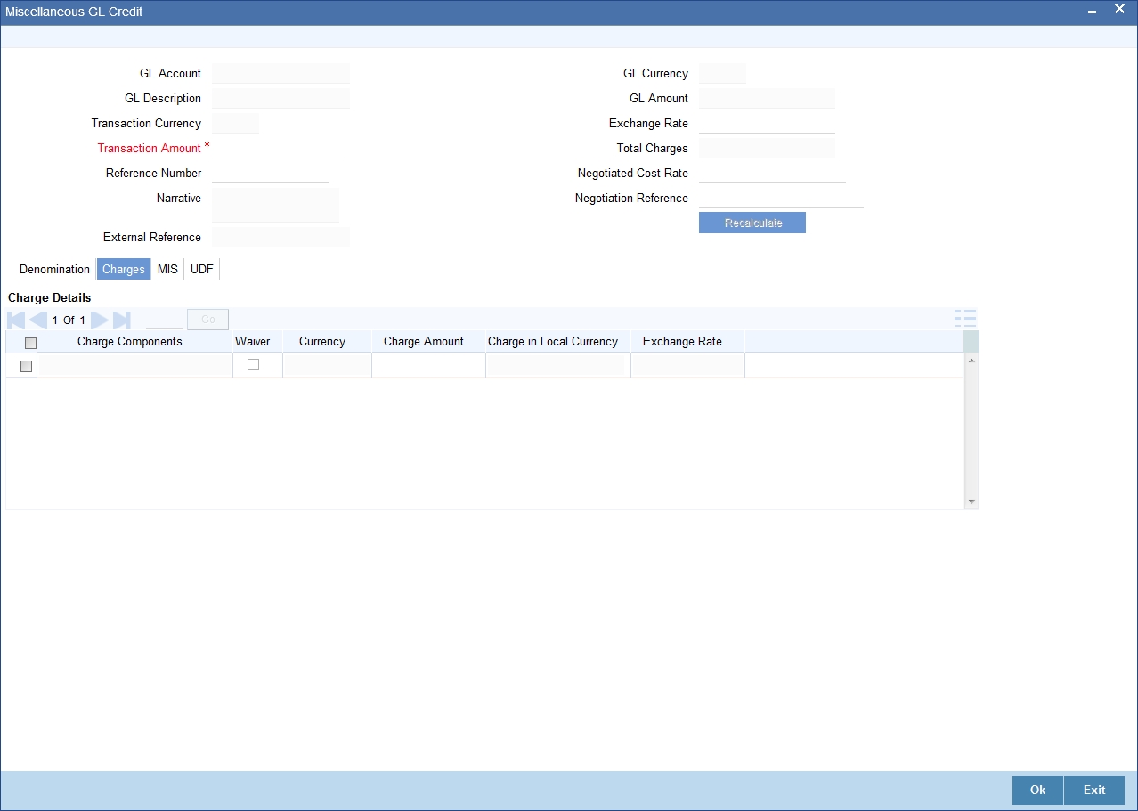 If you modify the transaction amount, then click ‘Recalc’ button to re-compute the amount to be credited to the GL account.