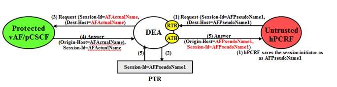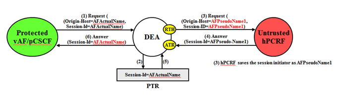 AF/pCSCF identities are hidden by replacing the actual host name portion of the Origin-Host and Session-ID AVPs with AF/pCSCF pseudo-host name. The Origin-Host and Session-ID AVPs may have different AF/pCSCF host names. A unique pseudo name must be created for each AF/pCSCF in a Protected Network. When the vAF/pCSCF initiates a transaction to the hPCRF, the hPCRF saves the vAF/pCSCF's identity for use in subsequent hPCRF-to-vAF/pCSCF transactions. This vAF/pCSCF's pseudo-host name must not only be unique, but the DEA must be able to convert the vAF/pCSCF's pseudo-name to an actual vAF/pCSCF host name for these subsequent hPCRF to vAF/pCSCF transactions.