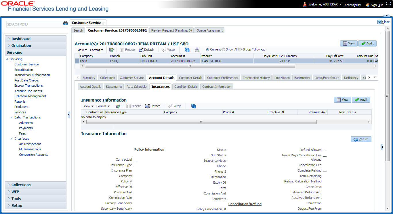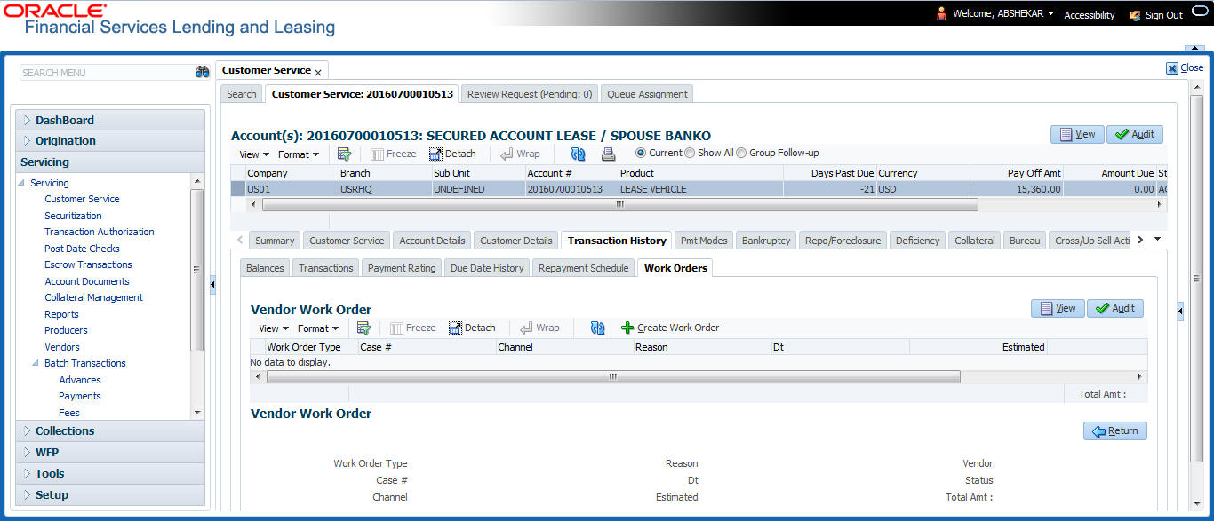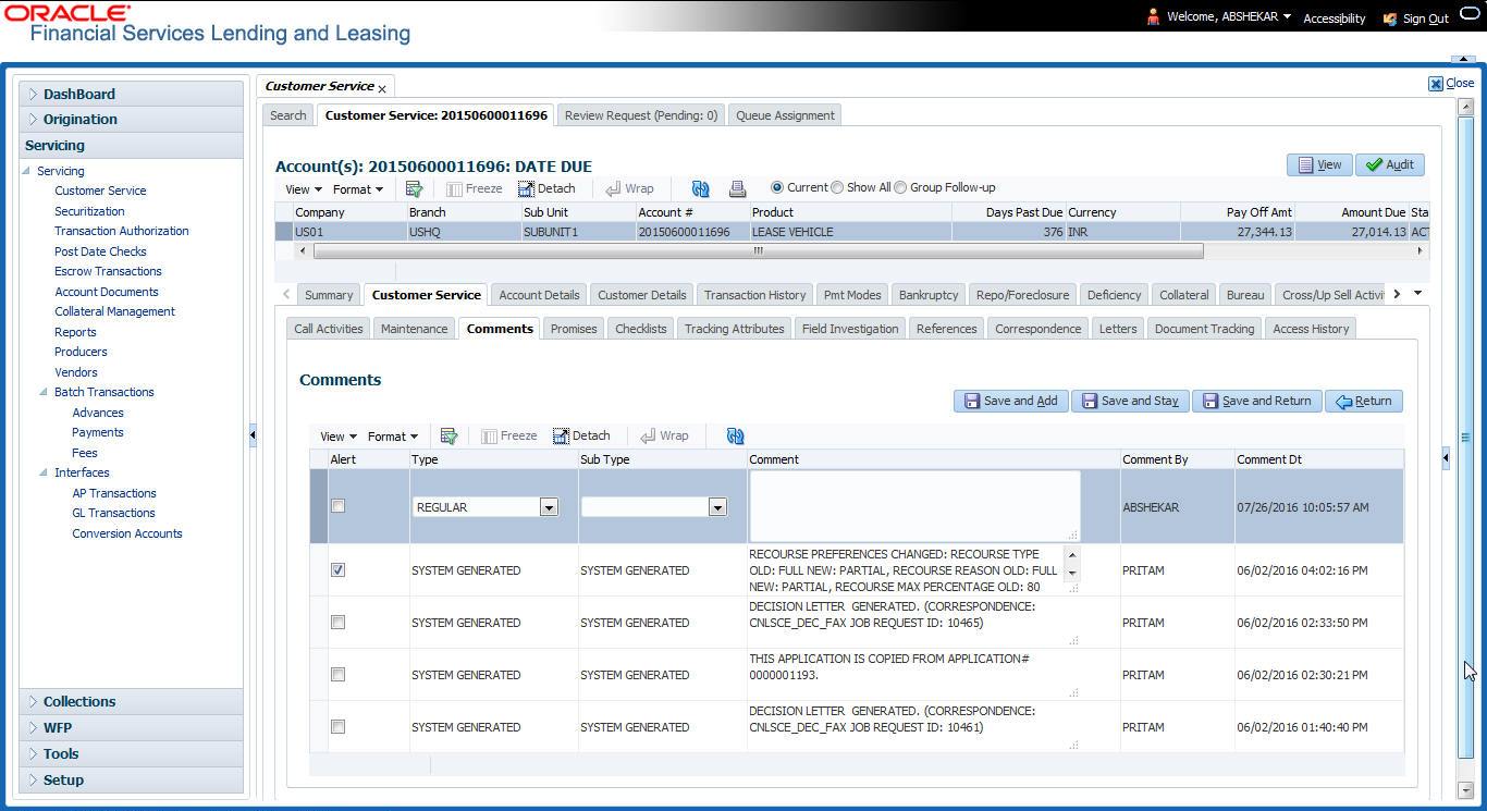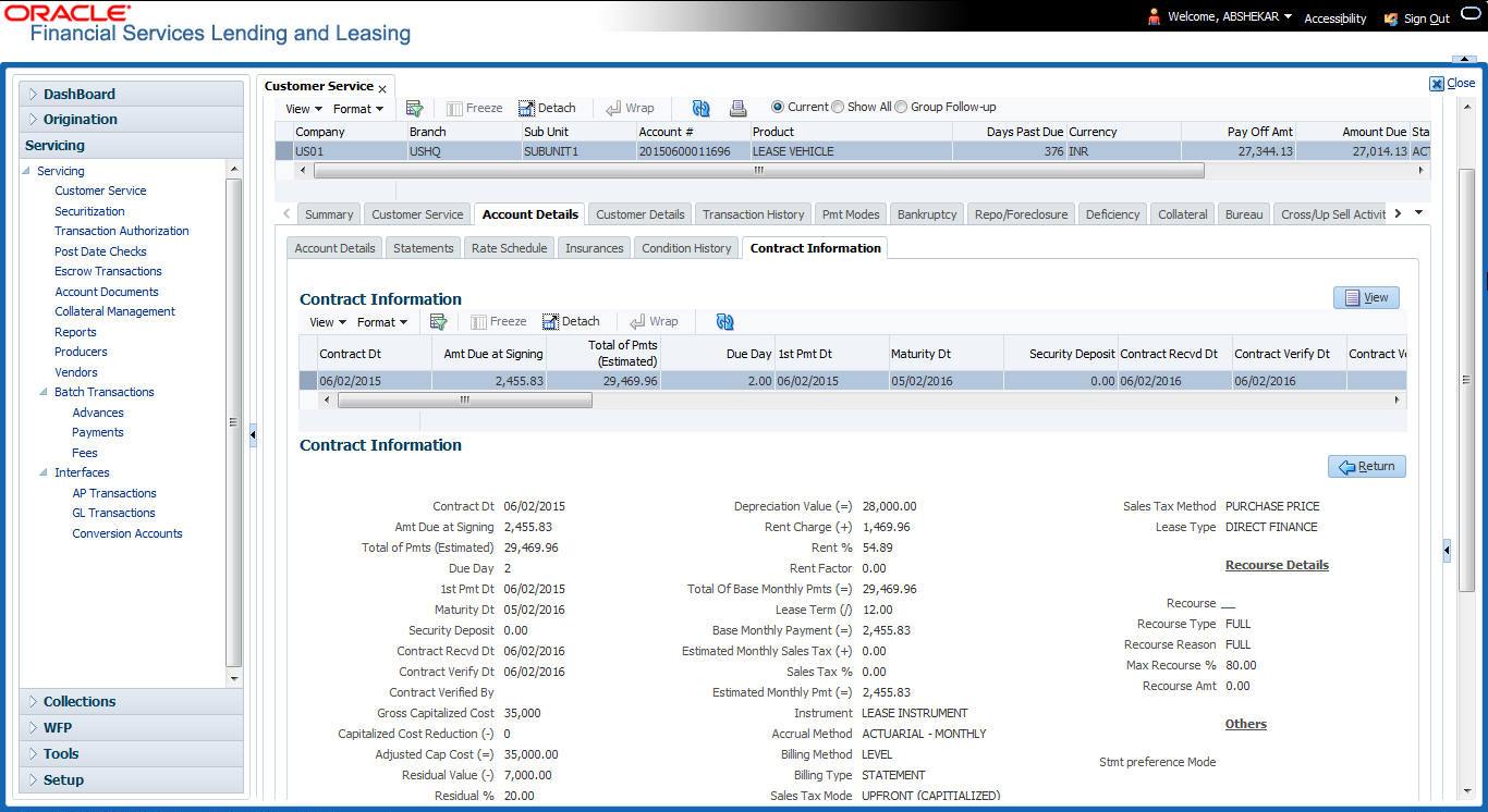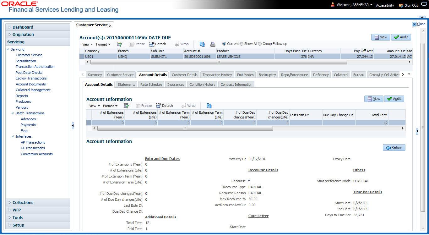 After an application has cycled through the Lease origination process, it becomes an account. Account maintenance and collections tasks can be performed with Oracle Financial Services Lending and Leasing’s Customer Service screen.