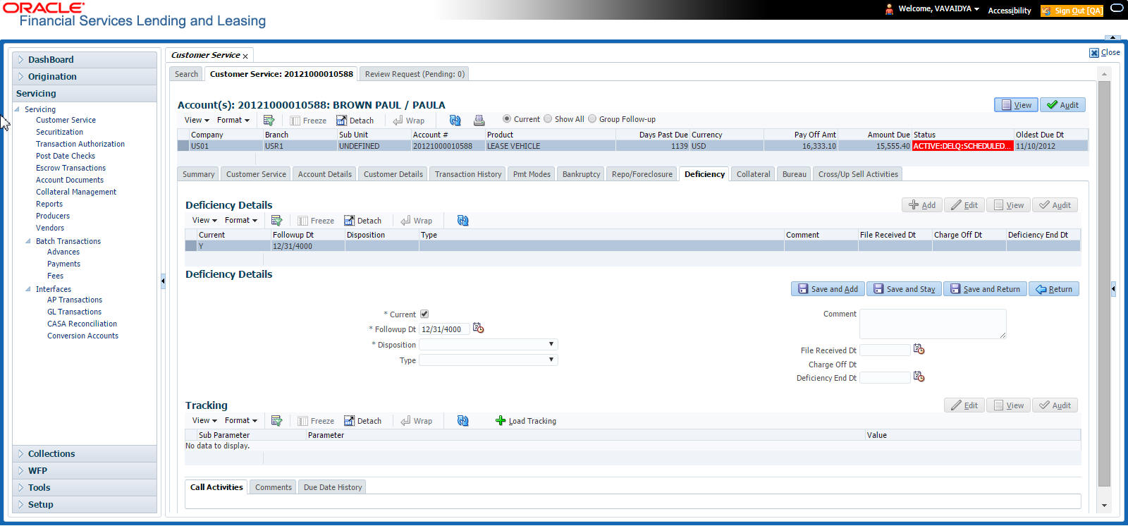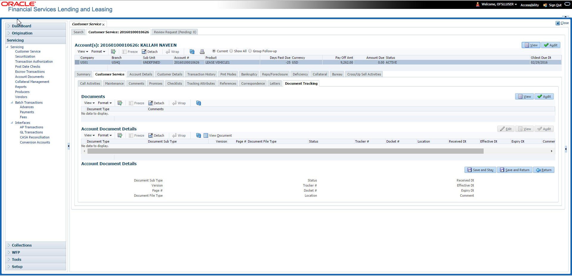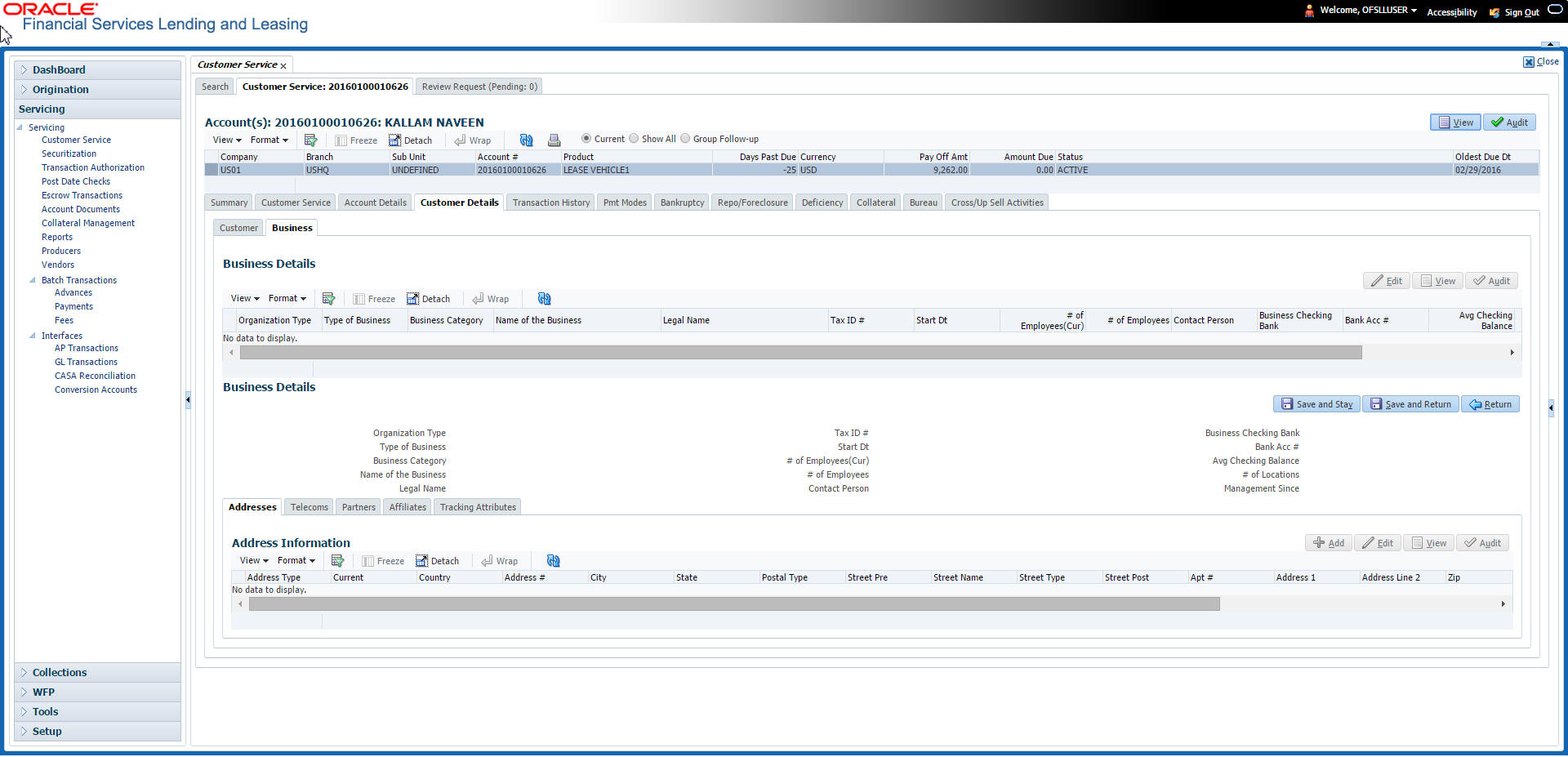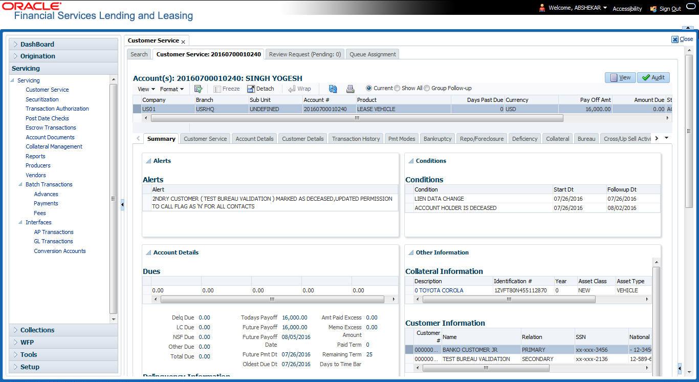 After an application has cycled through the Lease origination process, it becomes an account. Account maintenance and collections tasks can be performed with Oracle Financial Services Lending and Leasing’s Customer Service screen.