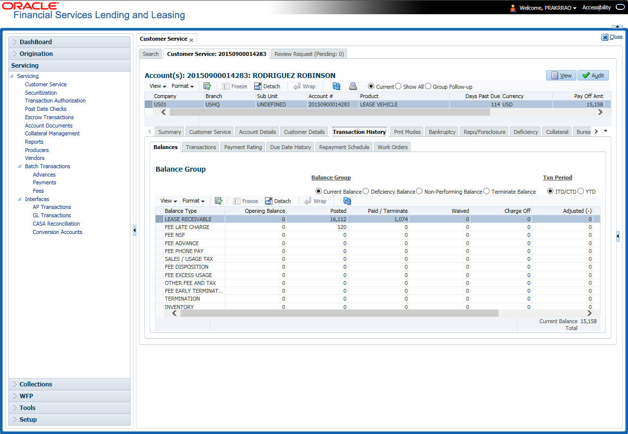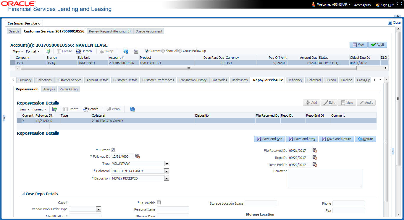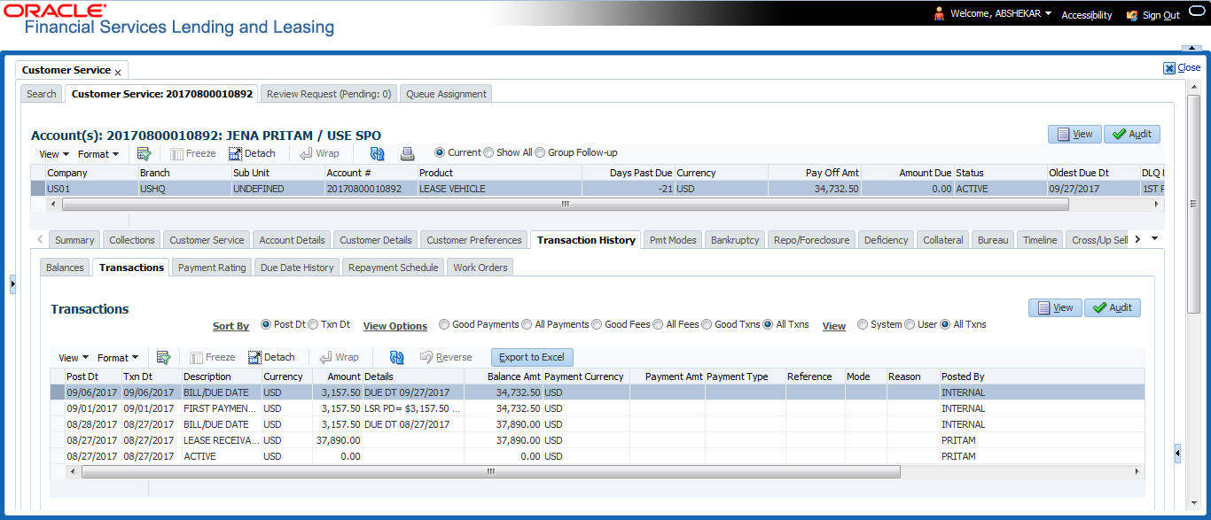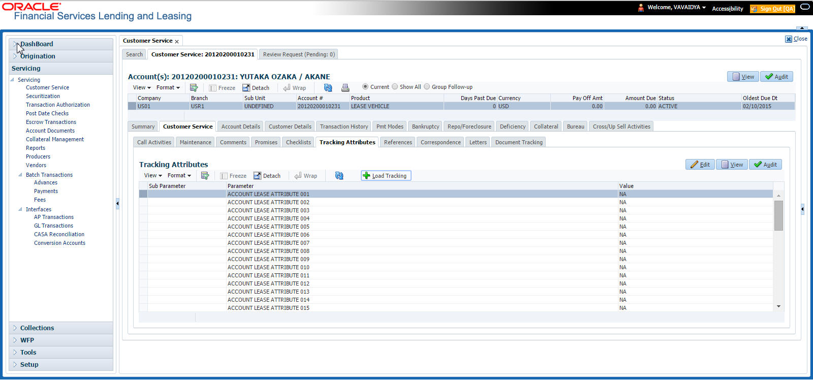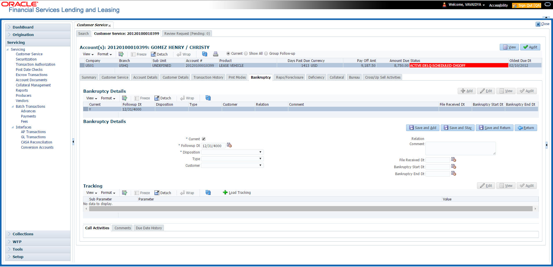 After an application has cycled through the Lease origination process, it becomes an account. Account maintenance and collections tasks can be performed with Oracle Financial Services Lending and Leasing’s Customer Service screen.