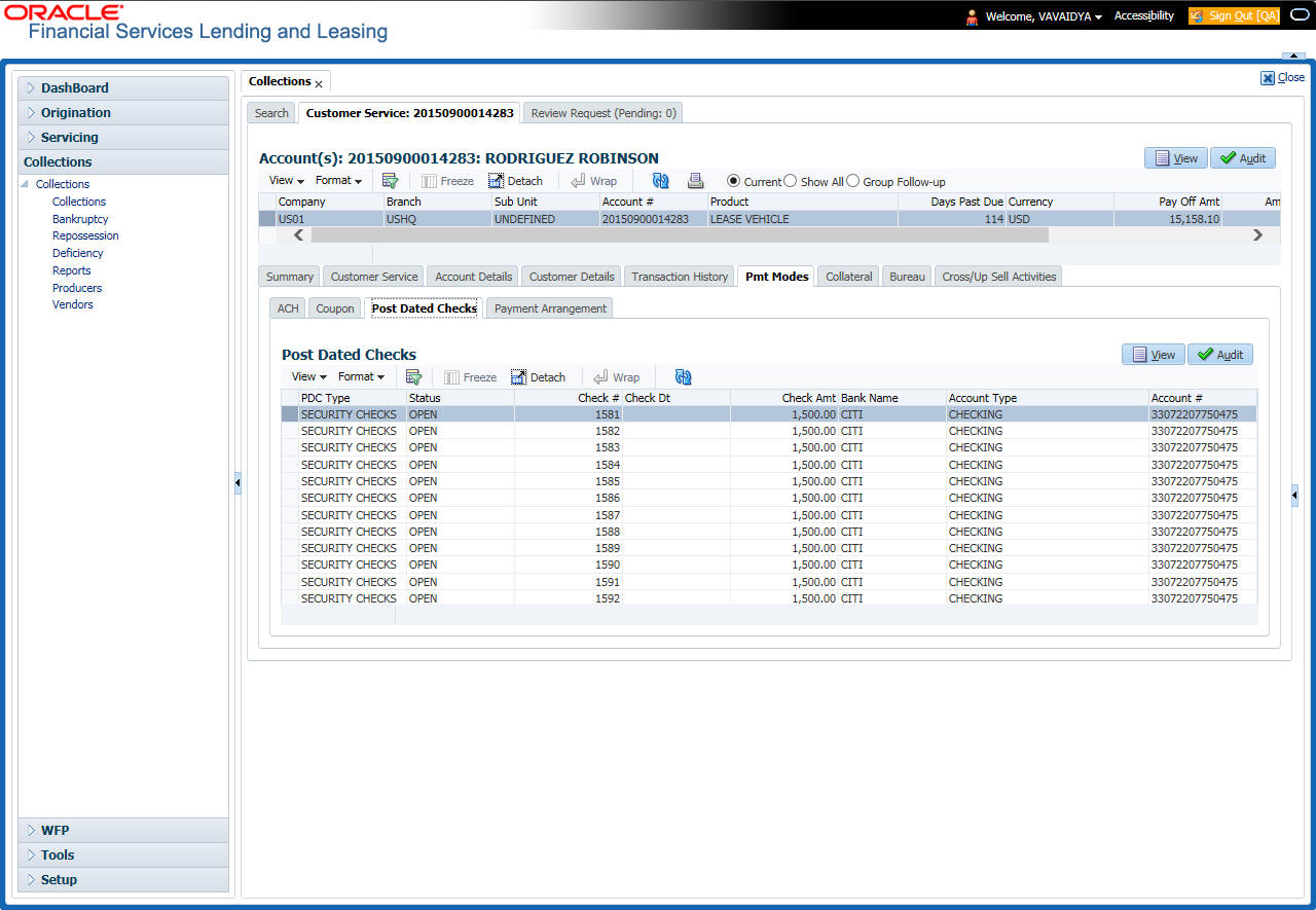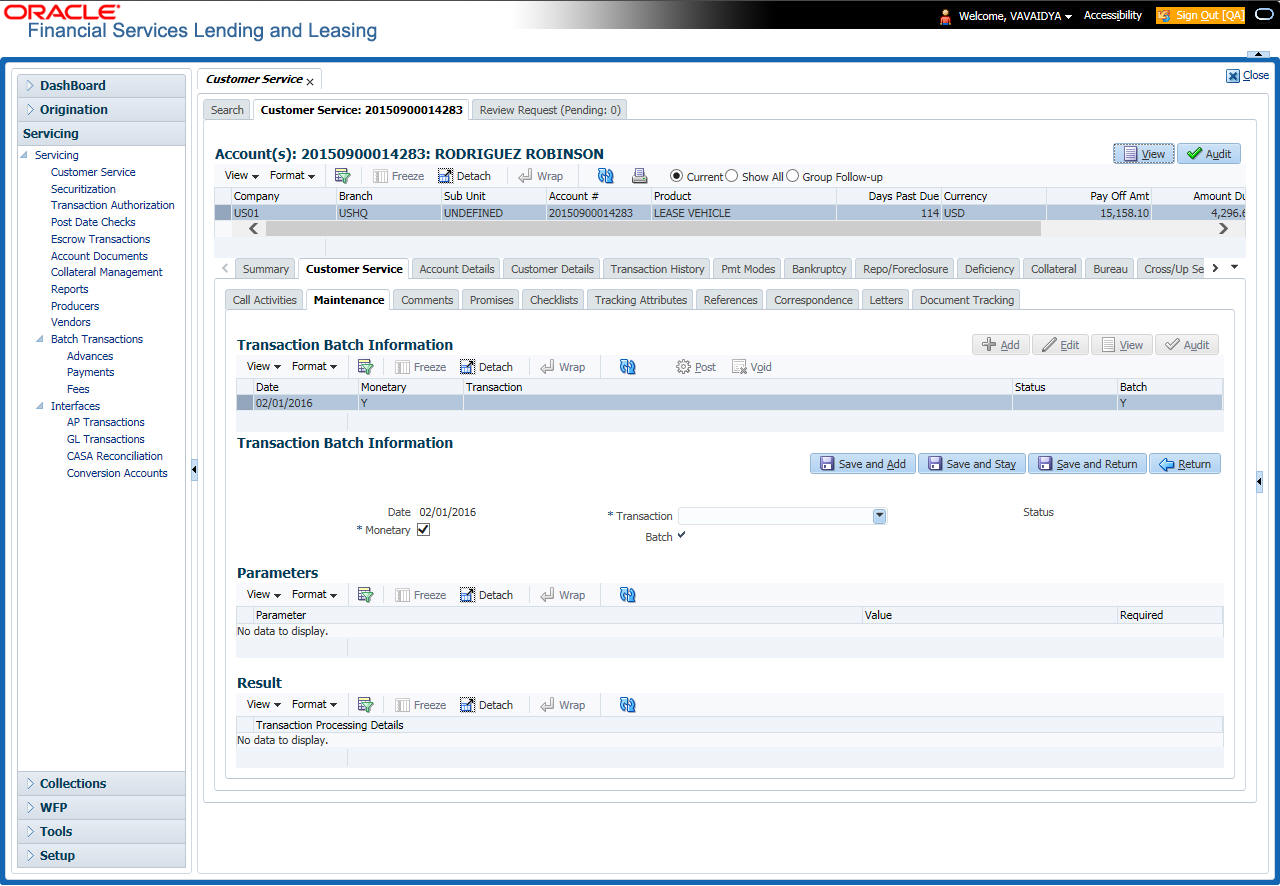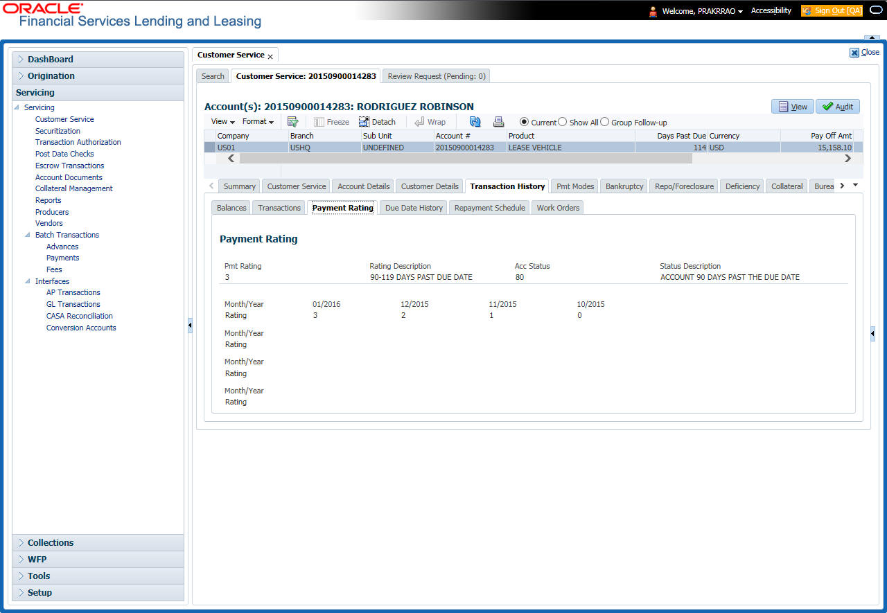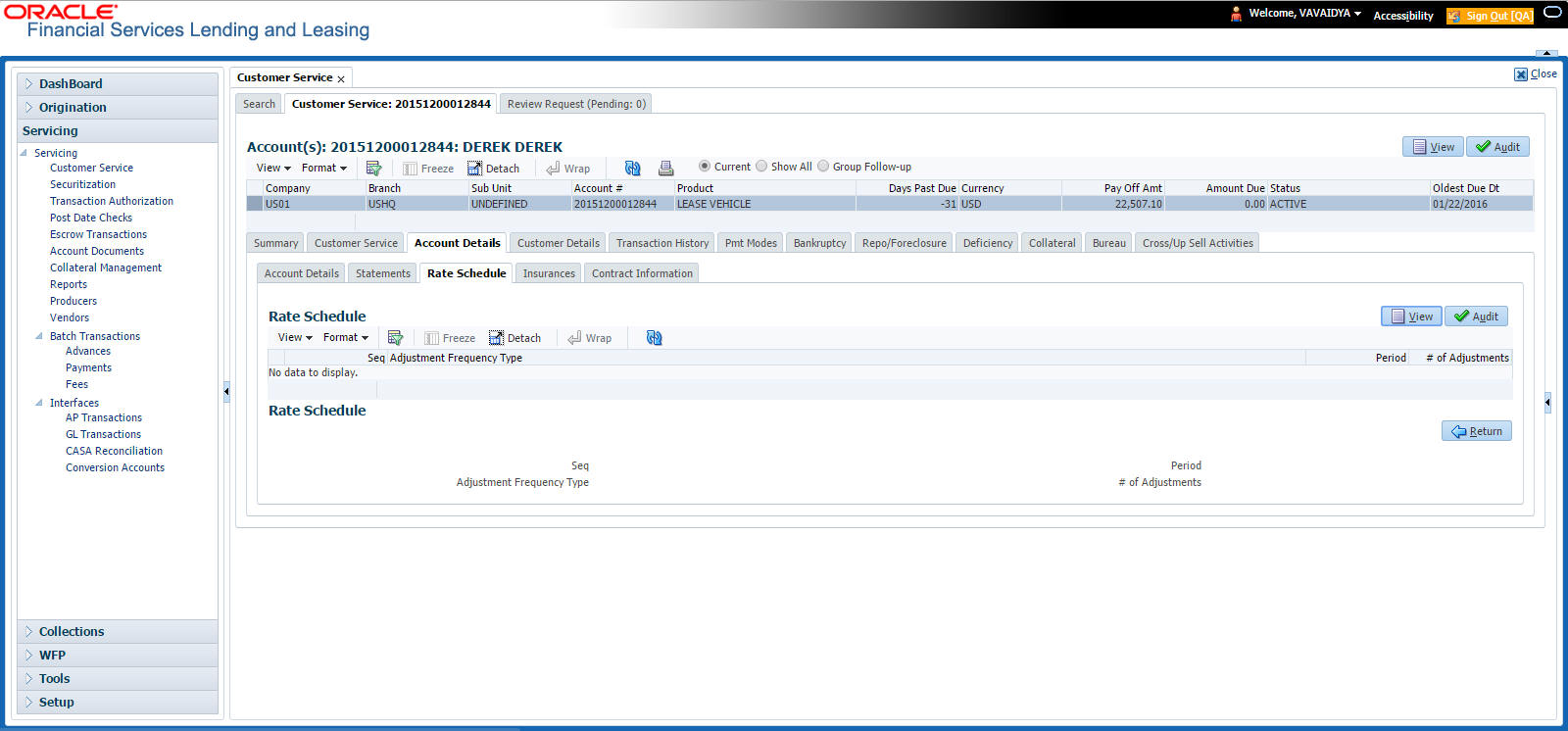After an application has cycled through the Lease origination process, it becomes an account. Account maintenance and collections tasks can be performed with Oracle Financial Services Lending and Leasing’s Customer Service screen.