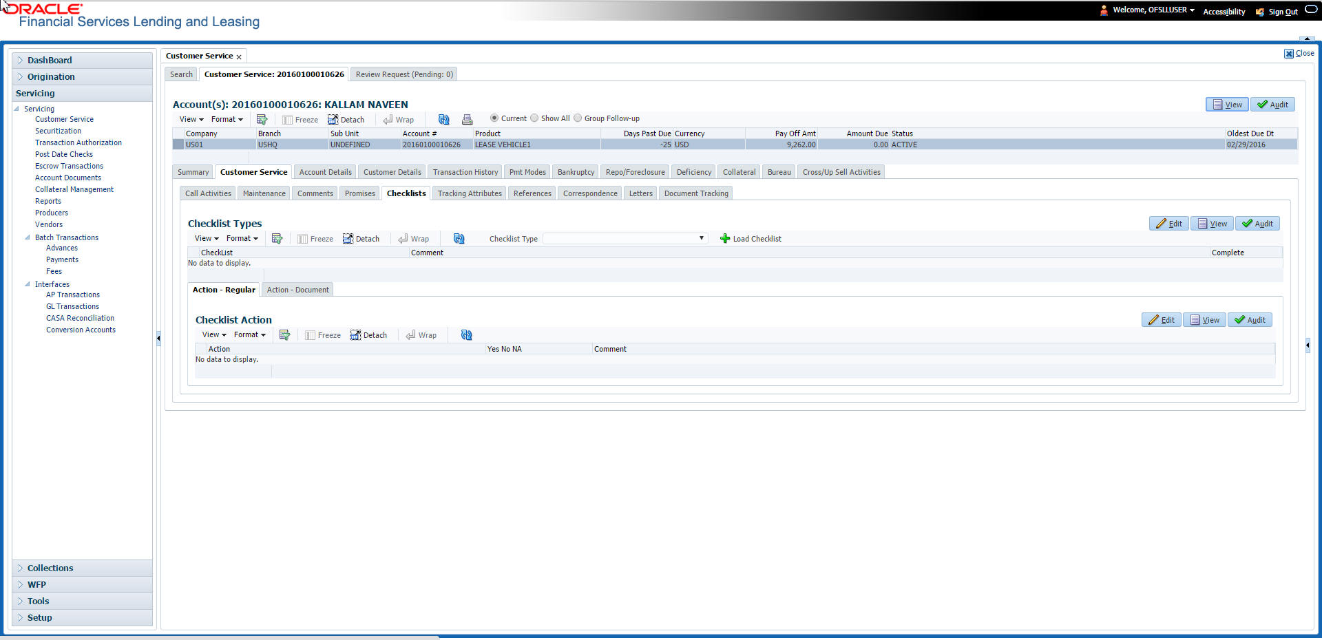 The Customer Service screen enables you to view and manage all customer information in a centralized location to ensure data integrity and provide better service. Oracle Financial Services Lending and Leasing provides online real-time information about the applicant(s), contract, account balances, dues, transactions, call activities, and comments. Oracle Financial Services Lending and Leasing also supports back-dating of financial transactions till the account’s opening date.