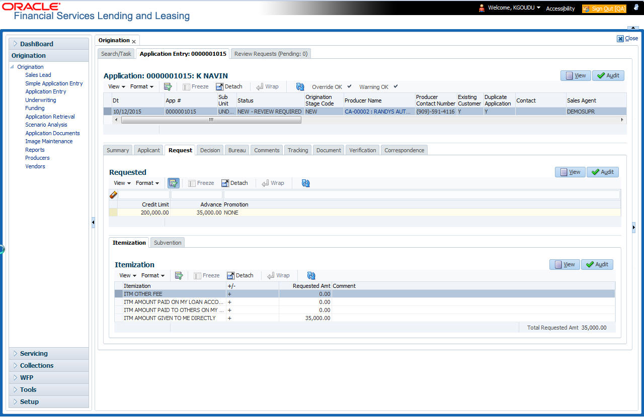 The Review Request tab facilitates to flag an Application for the attention of another Oracle Financial Services Lending and Leasing user and ask for review / feedback. It allows the system users to send and receive requests (including e-mail) commenting on a specific account or application. The Review Request tab supports iterative review of selected Application and also to process the review with multiple reviewers.
