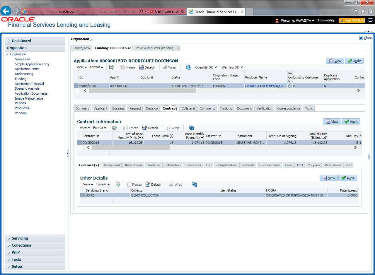 At this stage of the Lease origination process, the application has been entered into Oracle Financial Services Lending and Leasing and approved manually by an underwriter or by the system. The next step is to view and complete the contract information and make a funding decision to finance or reject the application. This is accomplished by using the Funding screen.