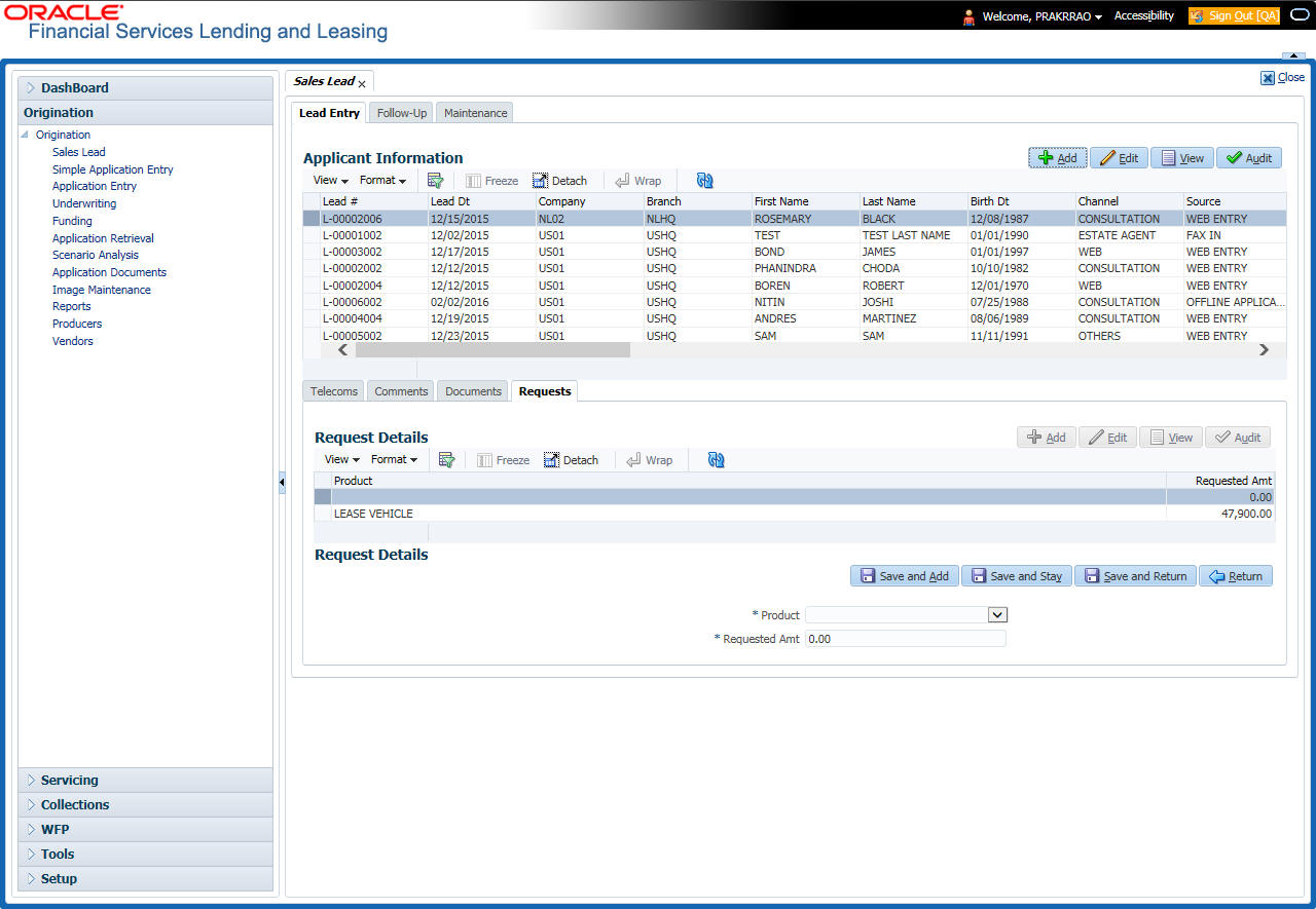 1. On the Oracle Financial Services Lending and Leasing home screen, click the Sales Lead master tab.