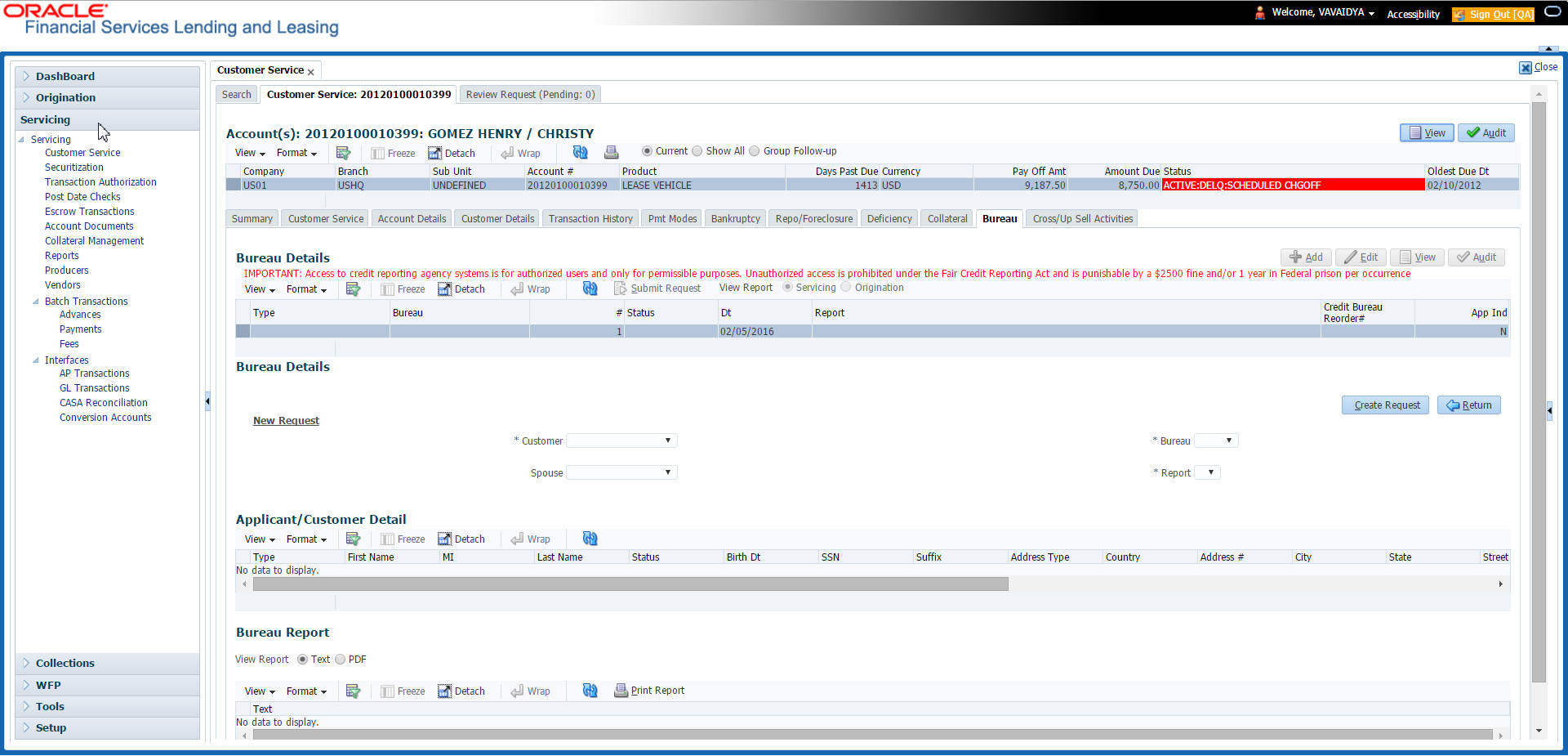 After an application has cycled through the Lease origination process, it becomes an account. Account maintenance and collections tasks can be performed with Oracle Financial Services Lending and Leasing’s Customer Service screen.
