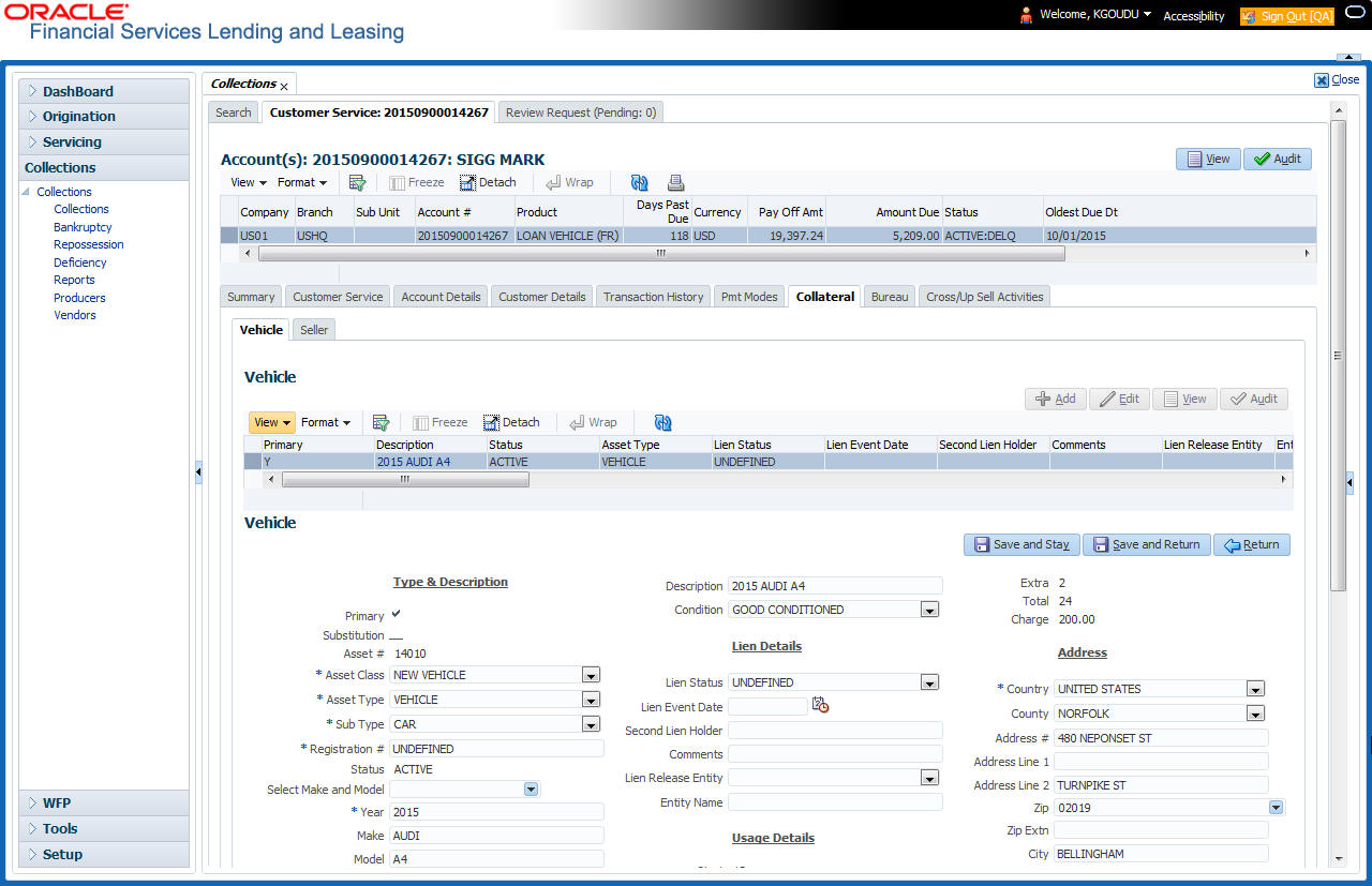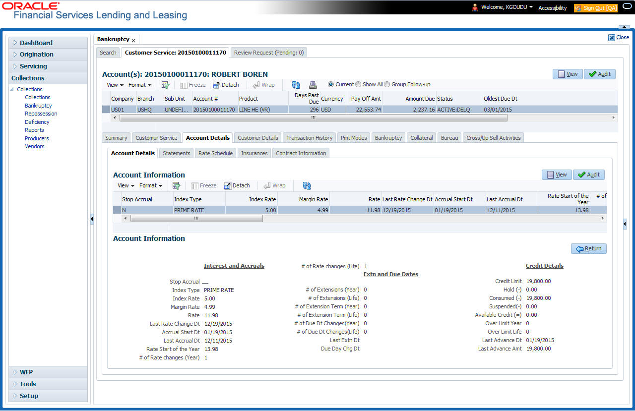 After an application has cycled through the Loan origination process, it becomes an account. Account maintenance and collections tasks can be performed with Oracle Financial Services Lending and Leasing’s Collection screen.