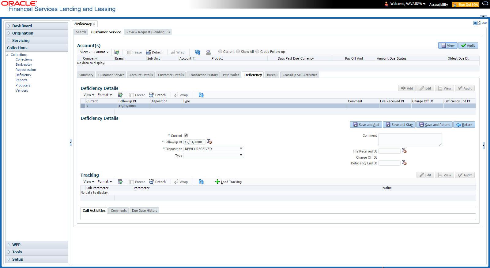 After an application has cycled through the Loan origination process, it becomes an account. Account maintenance and collections tasks can be performed with Oracle Financial Services Lending and Leasing’s Deficiency screen.