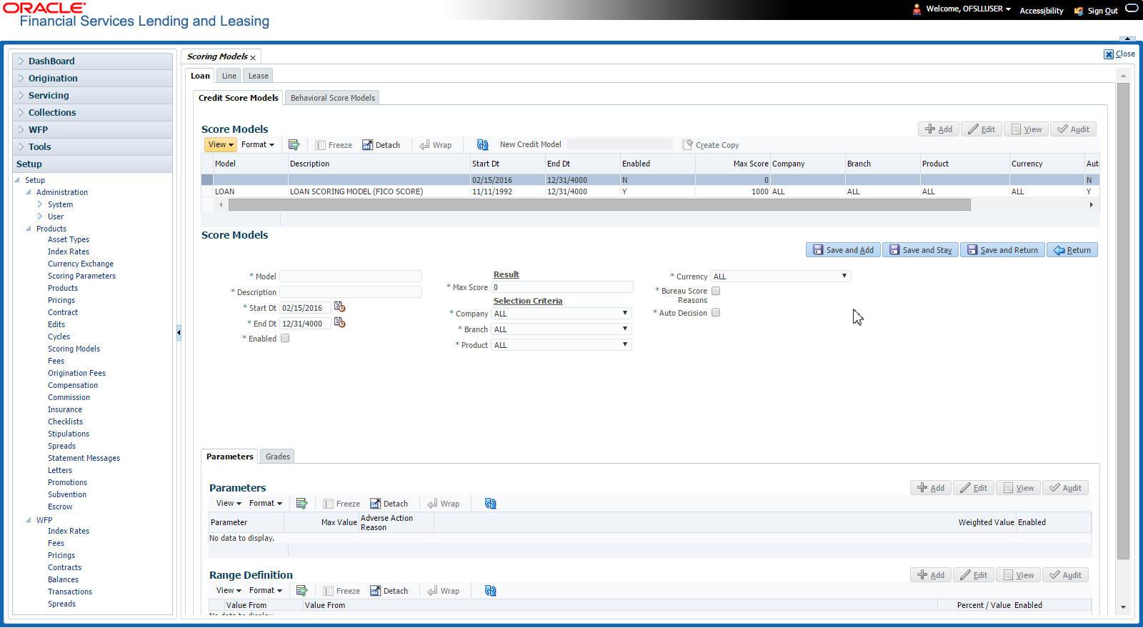 Parameters define the factors that can be used when scoring an application during underwriting and generating an initial decision on whether you wish to fund an amount. The combination of the flexible definition of these parameters, along with the scoring set up on the Scoring Models screen, allows you to automate much of the initial decision process in underwriting accounts.