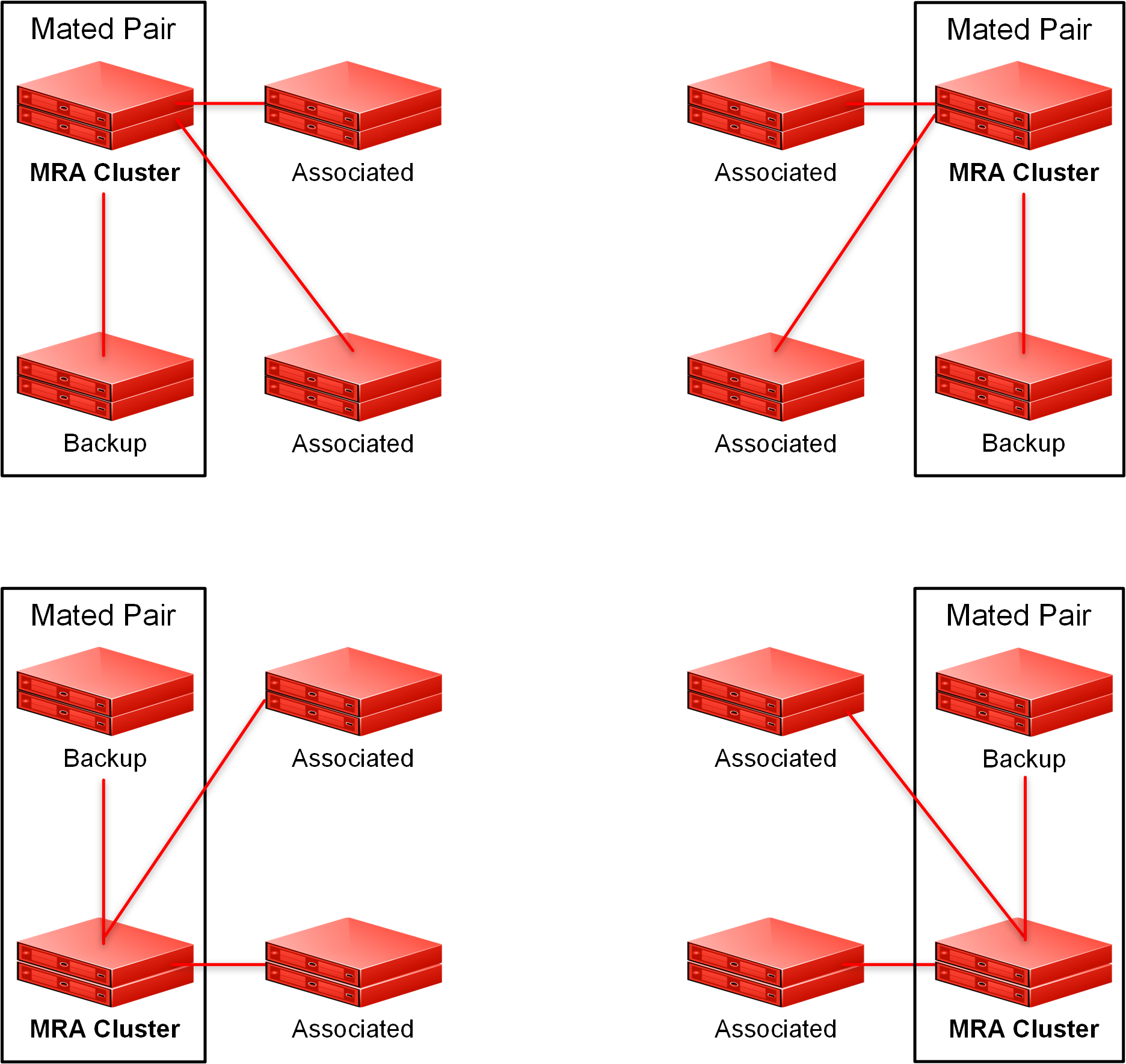 An MRA cluster can simultaneously be a backup to one MRA cluster and an associate of another. However, an MRA cluster cannot use the same MRA cluster as both a backup and an associate. Figure 1 shows a valid configuration of four MRA clusters, in two mated pairs, and how each cluster views its relationships with the other three. The four MRA clusters form a mesh network.