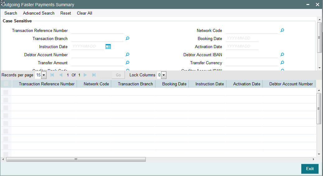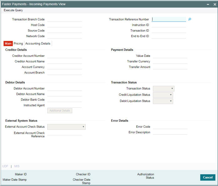 You can invoke ‘Faster Payment Incoming Payments View’ screen by typing ‘PFDIVIEW’ in the field at the top right corner of the Application tool bar and clicking on the adjoining arrow button..