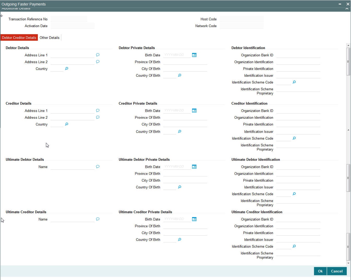You can invoke ‘Outgoing Faster Payment’ screen by typing ‘PFDOTONL’ in the field at the top right corner of the Application tool bar and clicking on the adjoining arrow button.This screen can be used to manually input the SCT Inst payment details for an outbound transaction..