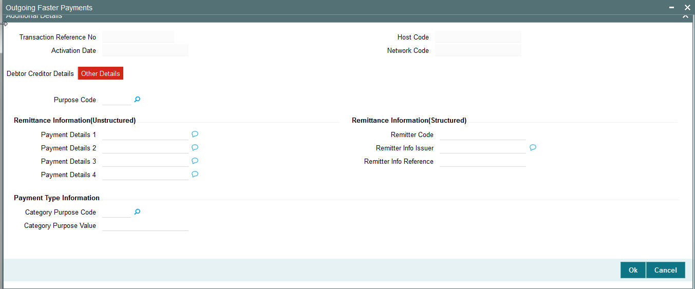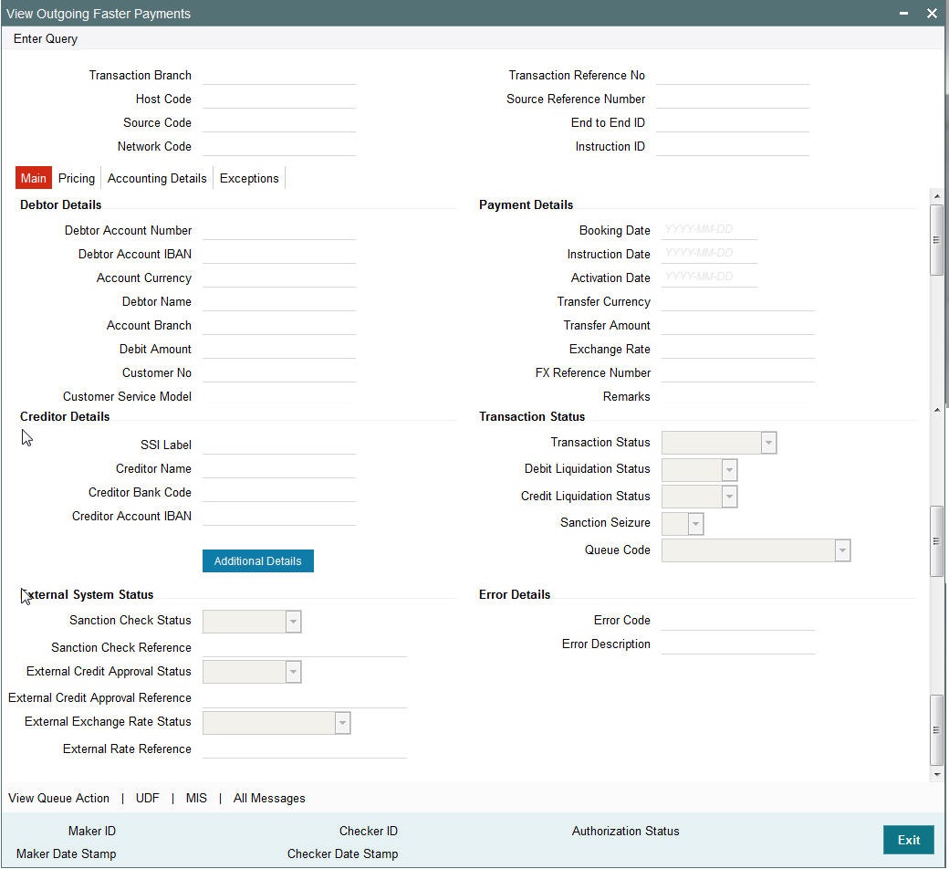 Under Main tab, click the Additional Details button in the Outgoing Faster Payment screen.