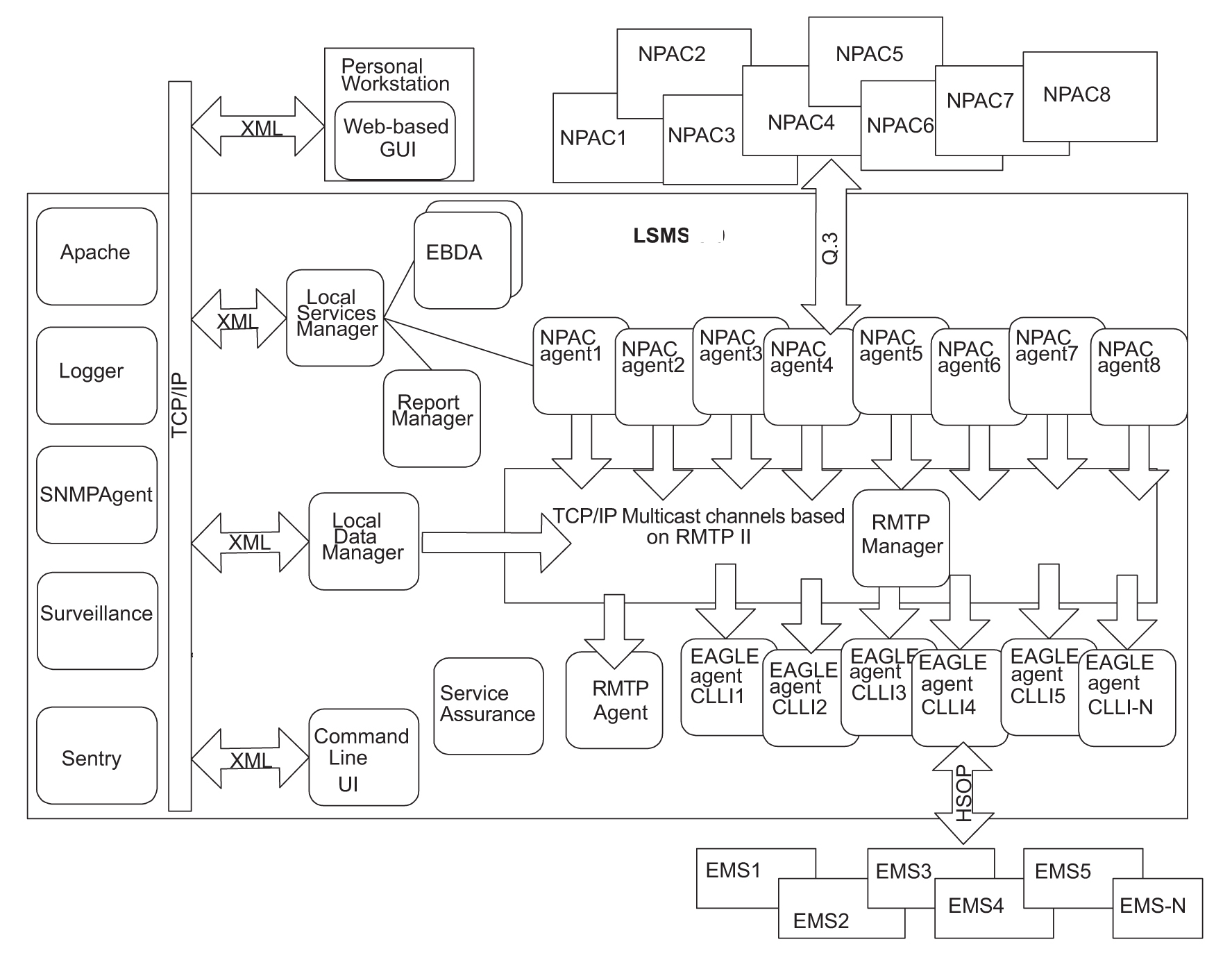 The Local Services Manager (lsman) is responsible for providing an interface between the Local GUI and the web-based GUIs and other LSMS processes. It acts as a gateway to the GUIs for processes (EBDA, Report Manager, and NPAC agents) that do not have direct access to the GUI, using Extensible Markup Language (XML) messages to communicate.