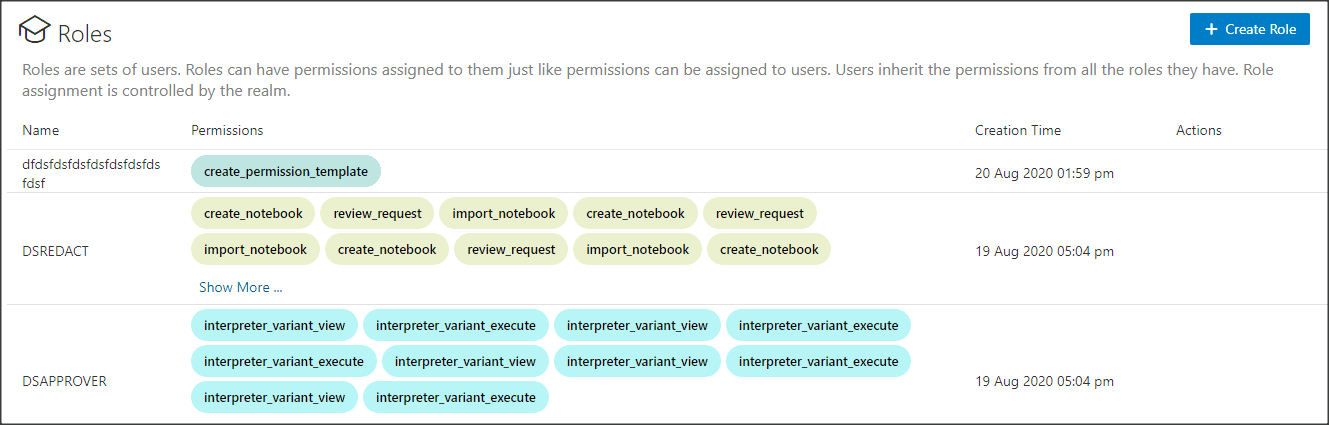 Authenticated users access FCC Studio through FCCRealm, SAMLRealm, and IDCSRealm. Users or User Groups are mapped to roles (DSADMIN, DSINTER, and so on) in the respective IDP (Identity Provider). Each role group is assigned to certain permissions (to use general, notebook, graph, interpreters, and so on). And, every permission has certain actions to perform (delete a paragraph, modify paragraph, execute interpreter variant, and so on). Hence, users or user groups mapped to roles can perform only assigned actions to which they have permissions.