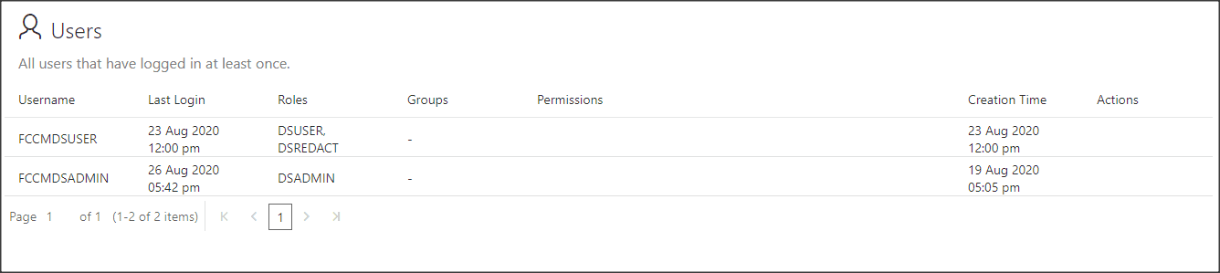 The Users section lists all the users, the date of their last login, and their roles, groups, other permissions. Users cannot be added or deleted in this section, but the groups they belong to can be updated.