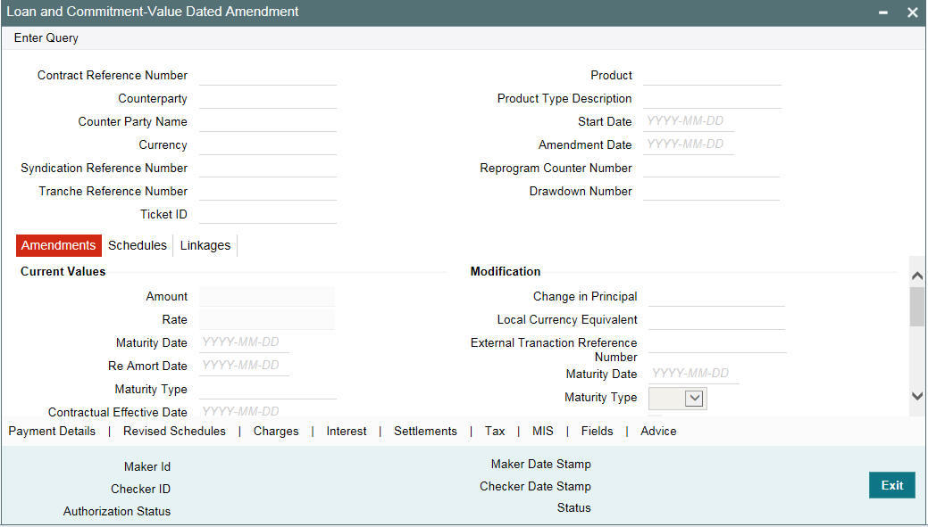 The changes to the terms of a loan, notified through this function, take effect on a date referred to as the “Value Date”. That is why the changes brought about by this function are called Value Dated Amendment.