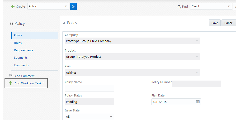 The Policy and Client contexts have an "Add Activity" event creation. When the workflow feature is “turned on” (system property) and the User is associated to the Workflow Roles and there exists Workflow Tasks that may be added manually to the current context (Policy, Client), the “Add Workflow Task” will appear.