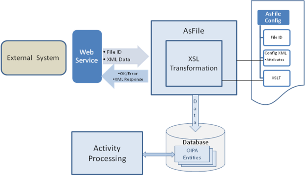 As the above diagram illustrates, a SOAP message is sent by an external system to the FileReceived web service and includes two parameters: FileID and XML data. FileID identifies the configuration from the AsFile table that will be used for processing and transforming inbound XML to OIPA business entities. Then, the created entities are persisted in the OIPA database. The AsFile configuration may also specify additional processing after the incoming date is stored in the database. Activities will be created and processed as dictated by business requirements for processing electronic submissions into the OIPA application.