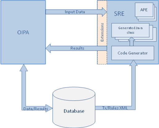 The above diagram shows a high level interaction between the calling application and SRE. OIPA calls SRE, provides input data, and implements interfaces to call back when additional date is needed by SRE. SRE does not directly make calls to the database, except for loading the transaction and rules associated with the current activity. When processing is complete, the results are packaged and returned to the calling application. Then, the results are committed to the database within a single database transaction.
