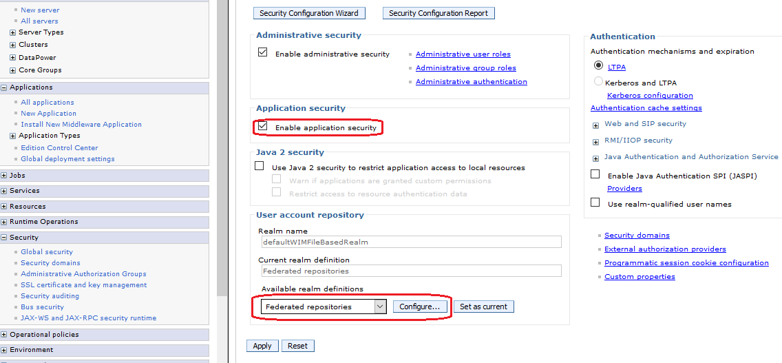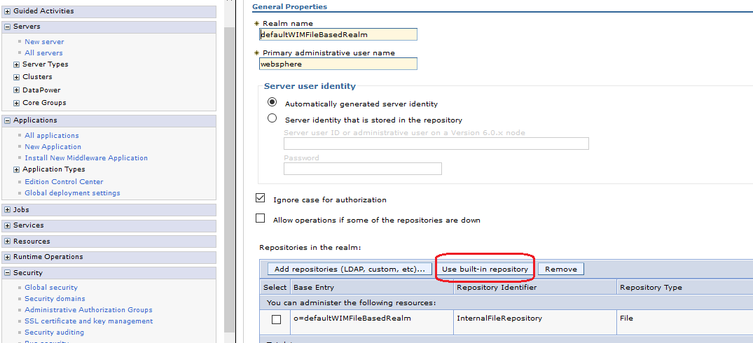 To use a file based user realm you have to configure “Federated repositories” under “User account repository”. If you create a new server profile from scratch, this should be the default setting. If you have to use an existing server profile, ensure that “Federated repositories” are configured in the following way: