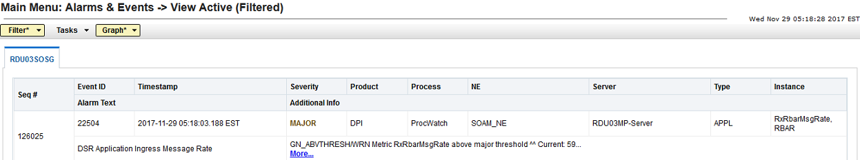 The value for metric ID for this alarm varies (RxPdraMsgRate, RxCpaMsgRate, for example) depending on which DSR application generates the alarm (CPA, FABR, Policy DRA, RBAR, etc.). Use the ID that corresponds to the specific DSR application in use.Note: